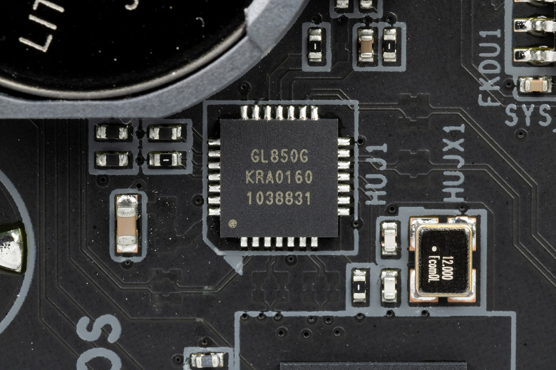 - 4 портов USB 2.0/1.1: 2 реализованы через контроллер Genesys Logic GL850G (на него потрачена 1 линия USB 2.0), еще 2 реализованы через второй контроллер Genesys Logic GL850G (на него потрачена 1 линия USB 2.0), при этом выводы объединены на правой стороне в общий разъем, к которому подключается прилагаемый к плате адаптер для образования привычных 2х внутренних разъемов (каждый на 2 порта).