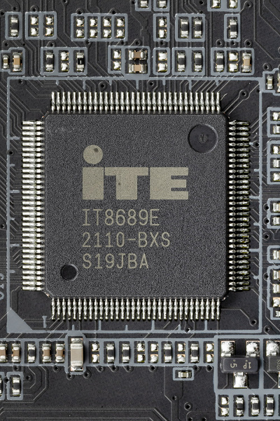 На оборотной стороне расположено практически ничего нет, кроме одного контроллера и мелкой логики. Текстолит обработан отменно: во всех точках пайки не только острые концы срезаны, но и все отшлифовано. Установлен бэкплейт в виде алюминиевой пластины с наноуглеродным покрытием. Также пластина помогает отводить тепло от задней стороны PCB через термоинтерфейс и обеспечивает жесткость материнской платы. Но я еще раз заострю внимание на том, что такую матплату вряд ли получится установить в корпусе, где в качестве опор для материнских плат используются не привычные всем латунные втулки, а выпрессованные возвышения, которые (по опыту) много шире, нежели выемки в задней пластине у материнки.