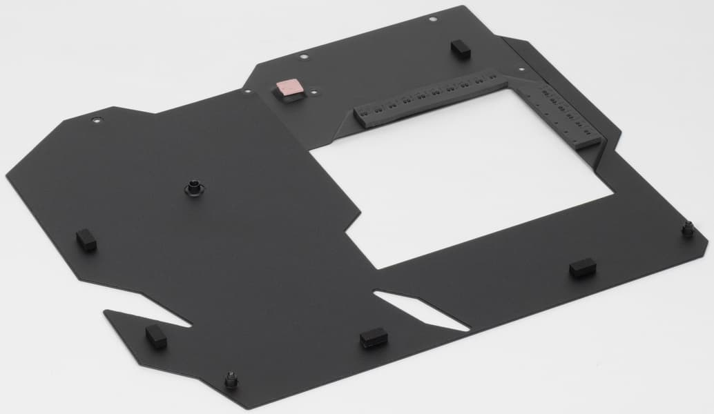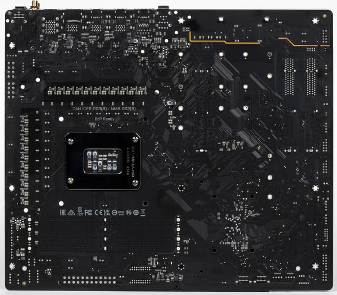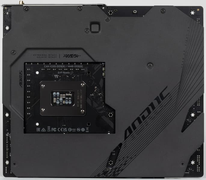 Материнская плата имеет бэкплейт, защитную пластину на оборотной стороне, которая также принимает участие в охлаждении в районе VRM через термопрокладки.