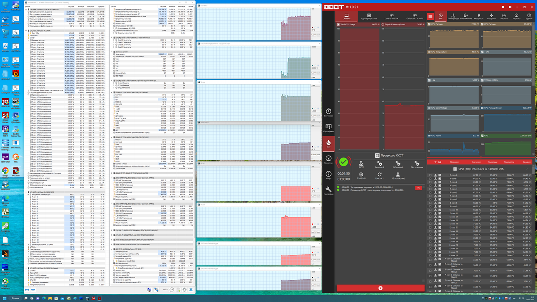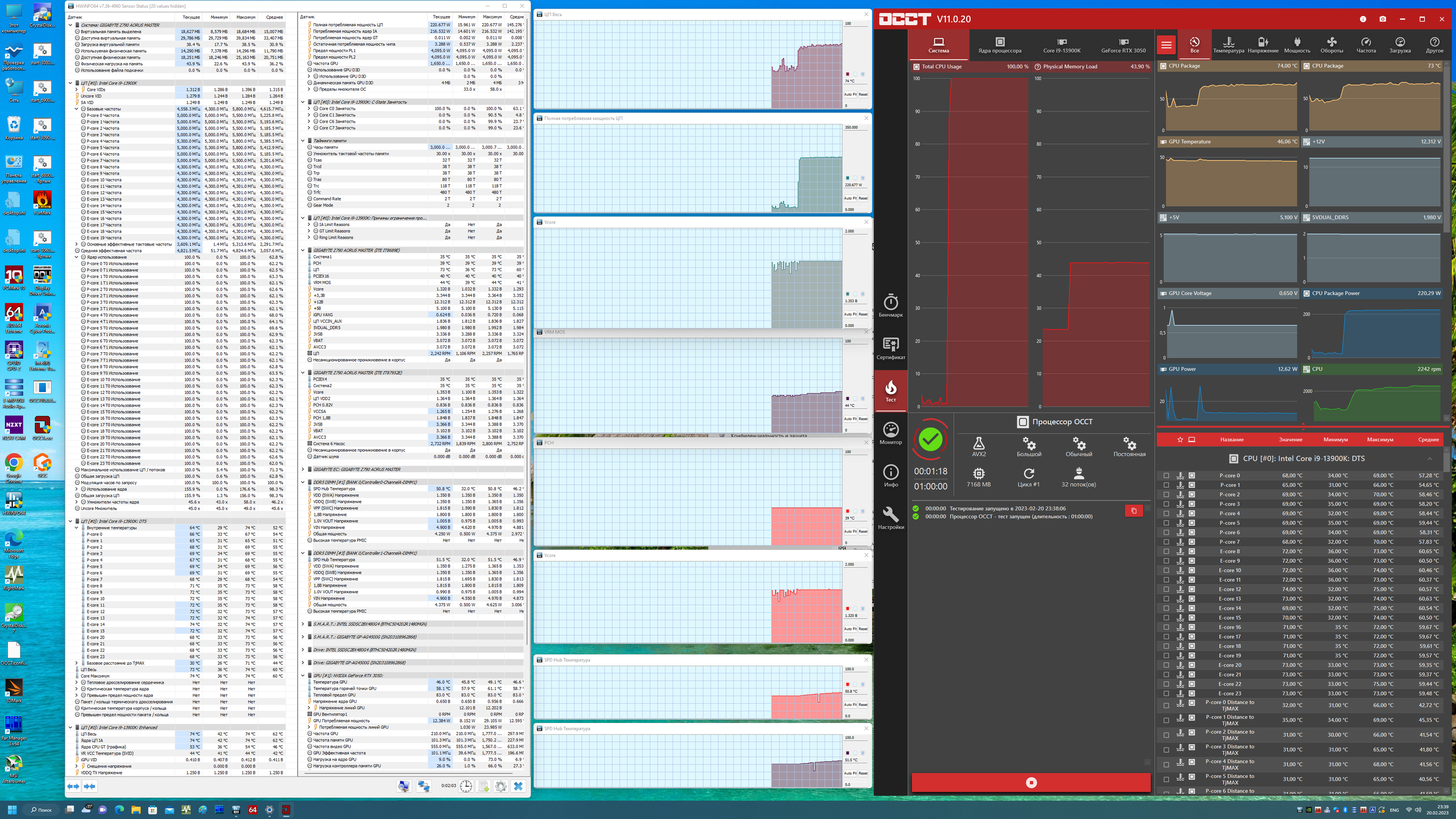 Скажу, что авторазгон не самый высокий, что мы видели ранее. Да, система по умолчанию, определив мощное питание матплаты, выставила приличные частоты, но я видел и 5,5 ГГц по всем P-ядрам. Что касается остальных параметров работы компонентов по нагреву, то все они были в норме. Потребление CPU переваливало за 220 Вт.
