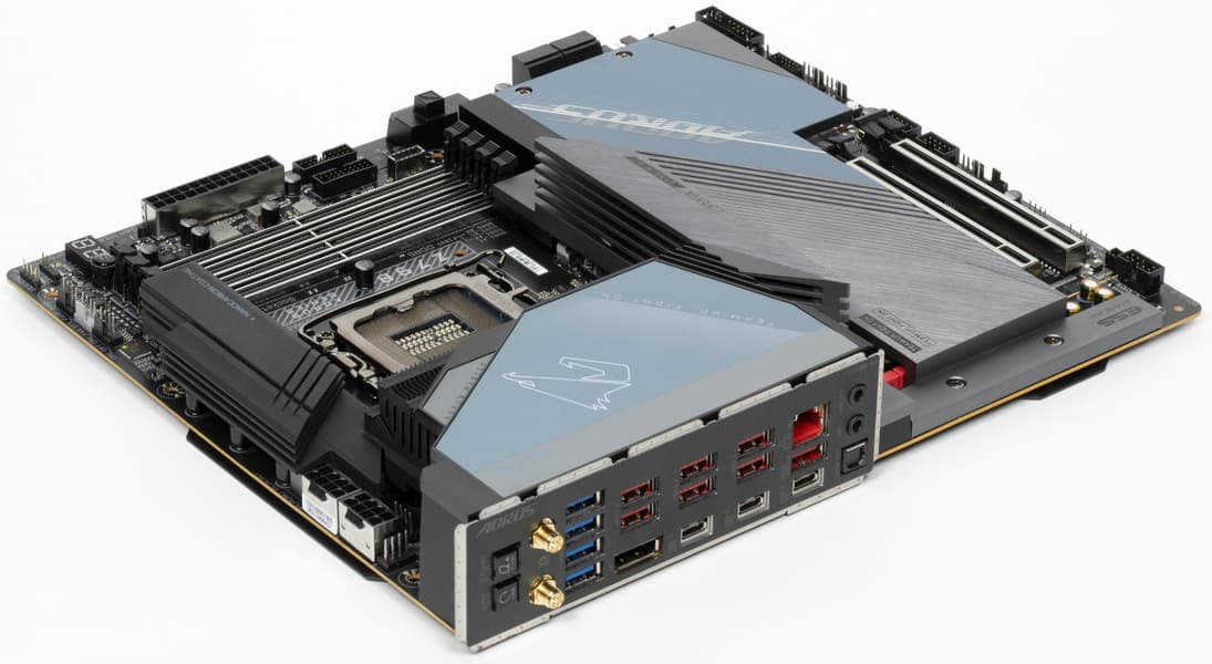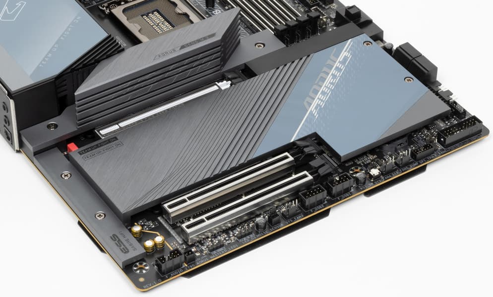 У Gigabyte Z790 Aorus Master имеется 23 порта USB разных видов, включая 7 очень быстрых USB 3.2 Gen2, а также три(!) USB 3.2 Gen2×2 в виде портов Type-C. Плата предлагает 3 слота PCIe х16, один из которых получает от процессора 16 линий PCIe версии 5.0, а два других работают в режимах х1 и x4 (подключены к Z790). Также у платы аж 5 слотов M.2: 2 слота подключены напрямую к процессору, при этом один линиями PCIe 4.0, а другой делит линии PCIe 5.0 со слотом PCIe x16, вынуждая последний переходить в режим х8. Три других слота М.2 подключены к чипсету Z790 линиями PCIe 4.0.