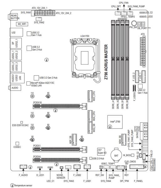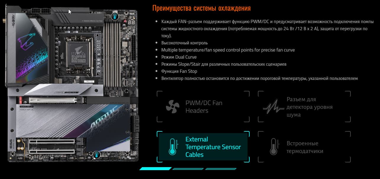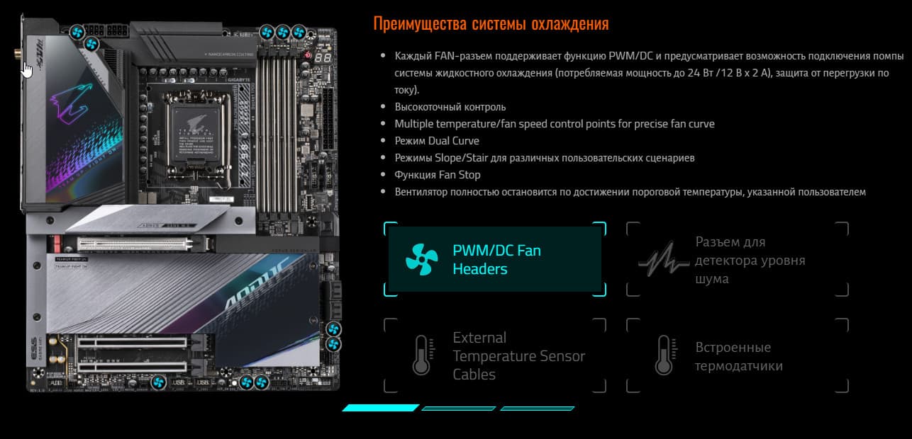 | Прочие внутренние элементы | 24-контактный разъем питания ATX 2 8-контактный разъем питания EPS12V 1 слот M.2 (E-key), занят адаптером беспроводных сетей 1 разъем для подключения порта USB 3.2 Gen2x2 Type-C 2 разъема для подключения 4 портов USB 3.2 Gen1 2 разъема для подключения 4 портов USB 2.0 10 разъемов для подключения 4-контактных вентиляторов и помп ЖСО 2 разъема для подключения неадресуемой RGB-ленты 2 разъема для подключения адресуемой ARGB-ленты 1 разъем аудио для передней панели корпуса 1 разъем для датчика шума 2 разъема для термодатчиков 1 разъем для устройств безопасности TPM 1 разъем для дискретных карт Thunderbolt 1 разъем для подключения управления с передней панели корпуса 1 кнопка включения питания Power 1 кнопка перезагрузки Reset |