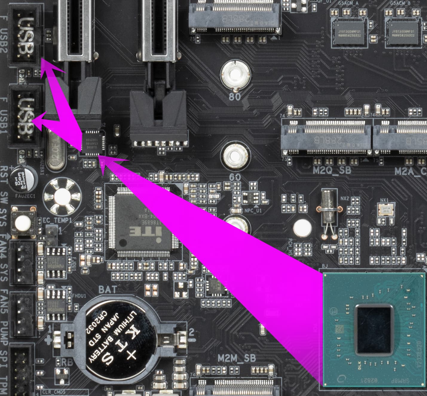 - 4 порта USB 2.0/1.1: все реализованы через контроллер Genesys Logic GL850G (на него потрачена 1 линия USB 2.0 от Z790) и представлены двумя внутренними разъемами (каждый на 2 порта).