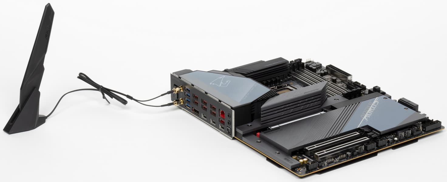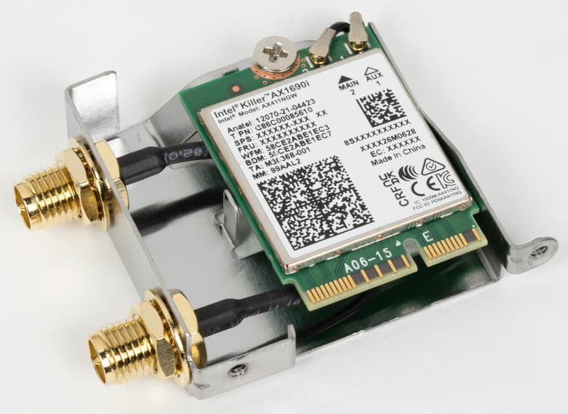 Имеется и комплексный беспроводной адаптер на контроллере Intel AX411NGW, через который реализованы Wi-Fi 6E (802.11a/b/g/n/ac/ax) и Bluetooth 5.2. Он установлен в слот M.2 (E-key), и его разъемы для привинчивания выносных антенн выведены на заднюю панель.