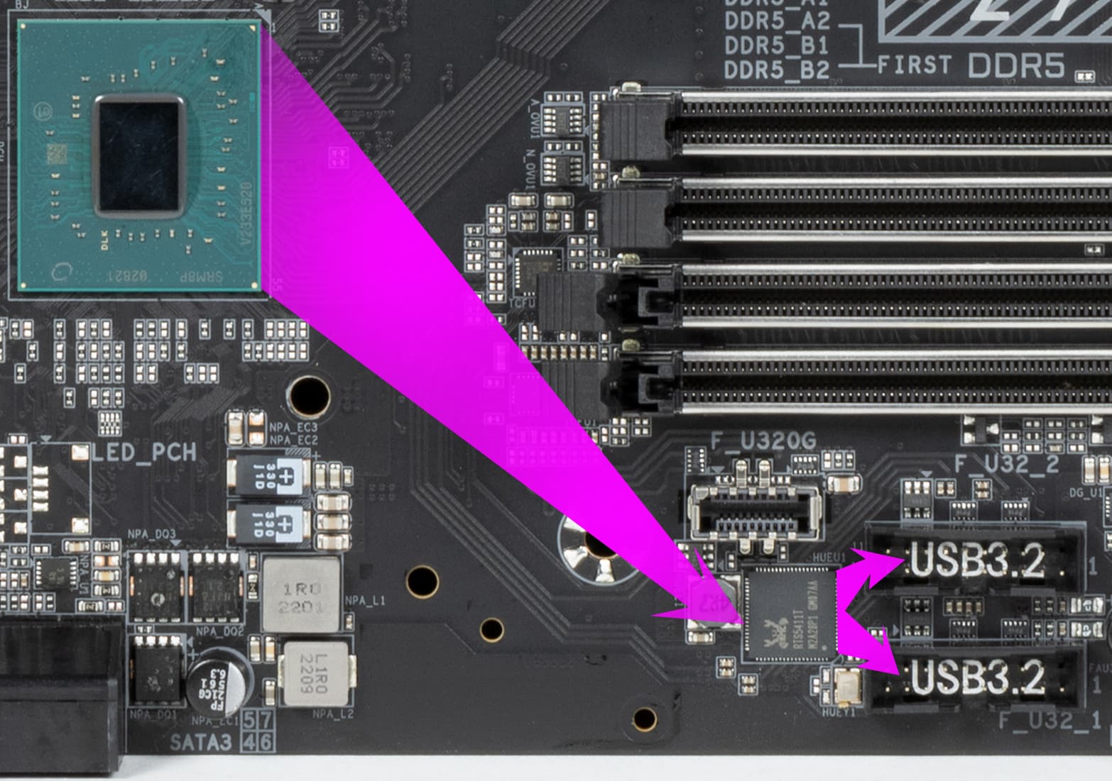 - 7 портов USB 3.2 Gen2: 4 реализованы через контроллер Realtek RTS5487 (на него потрачена 1 линия PCIe от Z790) и представлены на задней панели портами Type-A (красного цвета); еще 3 реализованы через второй контроллер Realtek RTS5487 (на него потрачена 1 линия PCIe от Z790) и представлены также на задней панели портами Type-A (красного цвета);;