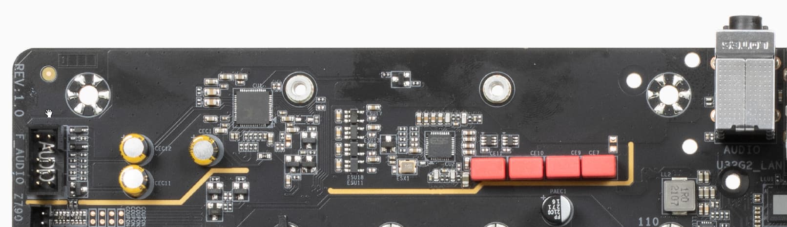 Аудиотракт вынесен на угловую часть платы, не пересекается с другими элементами. У карты два универсальных разъема с позолоченным покрытием по приему и выводу сигналов плюс оптический S/PDIF. Вывод по схеме 5.1 возможен только через S/PDIF (аналоговая схема упрощена до стерео).