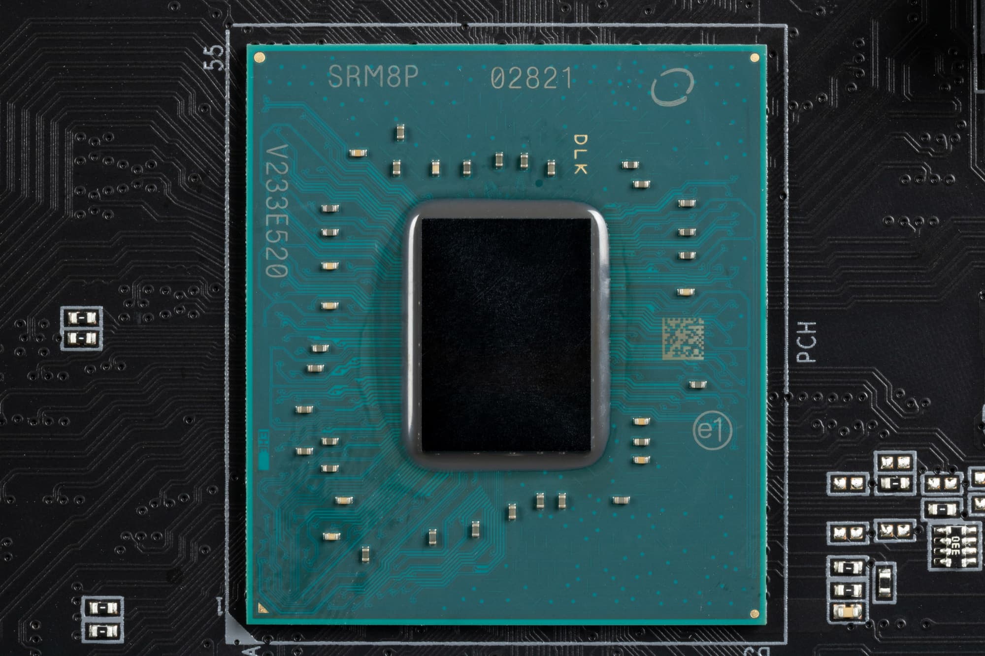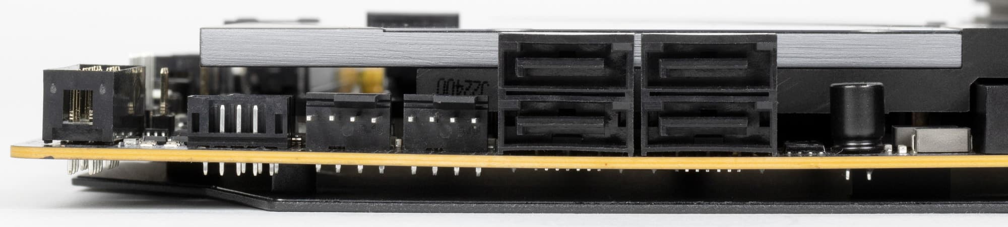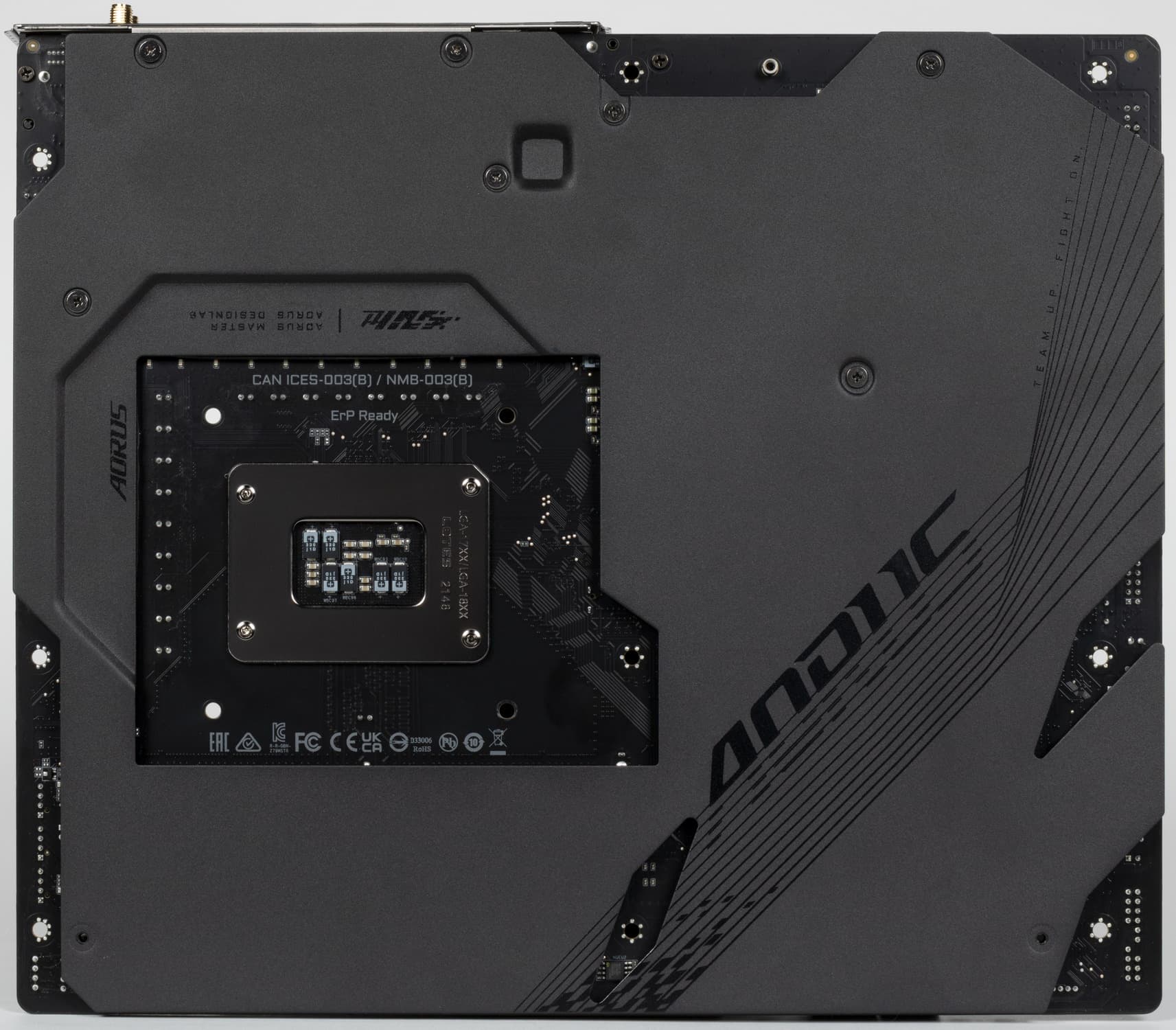 На оборотной стороне расположено несколько контроллеров и традиционная некоторая логика. Текстолит обработан хорошо: во всех точках пайки не только острые концы срезаны, но и все неплохо отшлифовано. На задней стороне установлена пластина из алюминия с наноуглеродным покрытием. Она помогает отводить тепло от задней стороны PCB через термоинтерфейс и обеспечивает жесткость материнской платы.