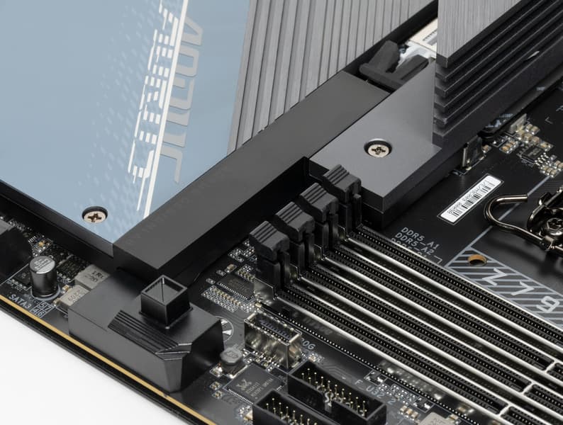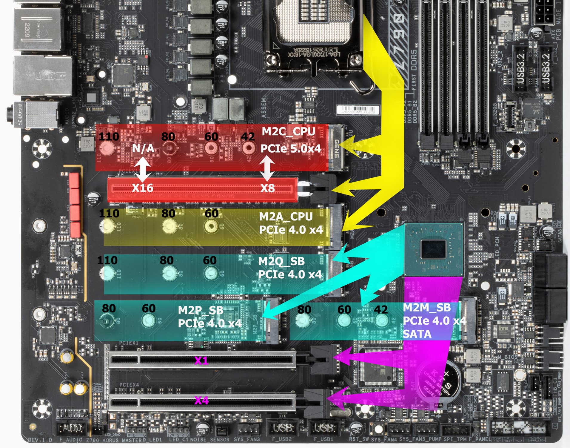 Третий, четвертый и пятый слоты M.2 (M2Q_SB, M2P_SB, M2M_SB) получают данные от чипсета Z790, а первые два — от CPU, при этом M2C_CPU получает PCIe 5.0, деля ресурсы со слотом PCIe x16_1 (о чем я уже выше рассказывал), а M2A_CPU штатно получает от процессора PCIe 4.0.