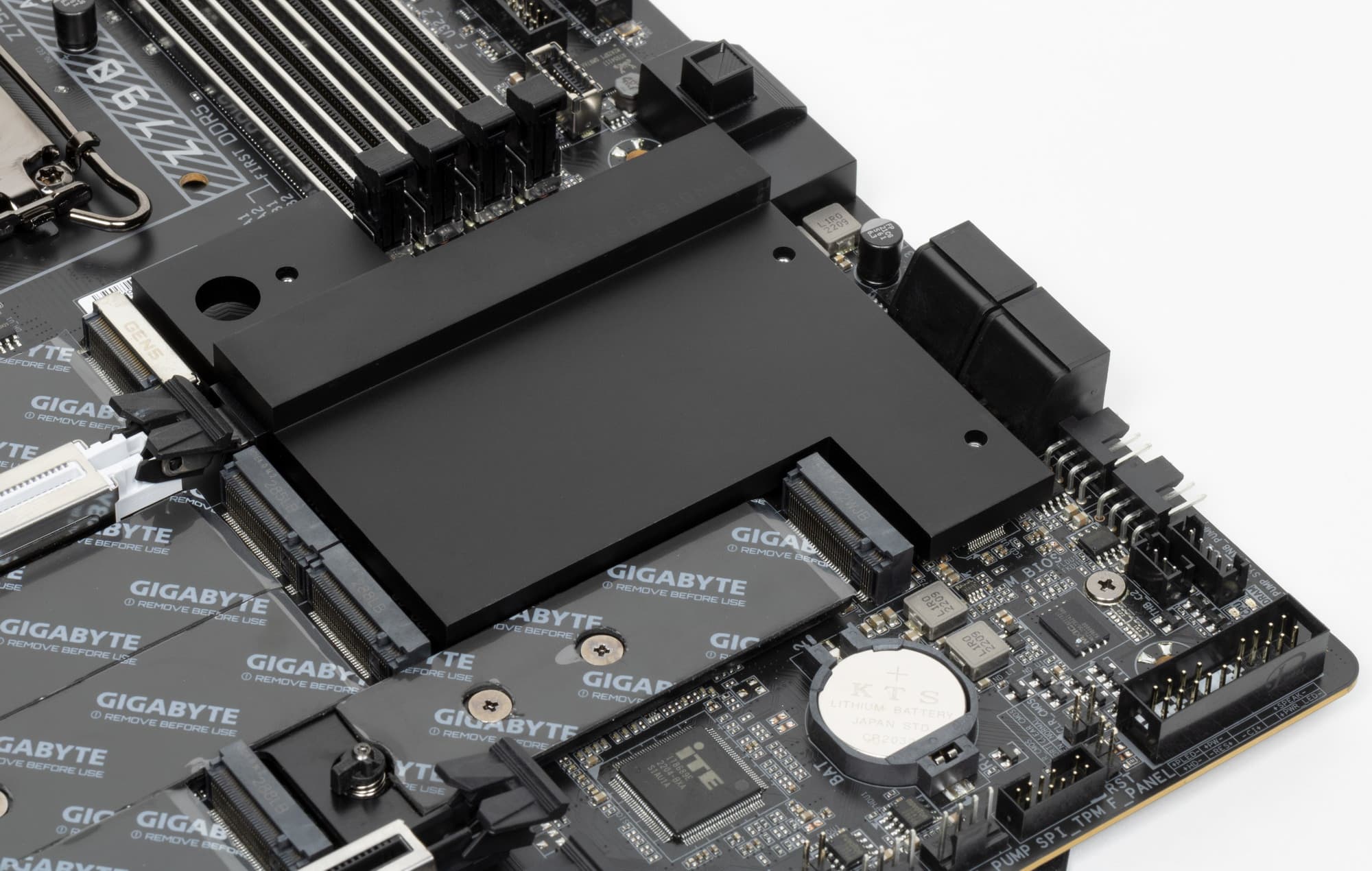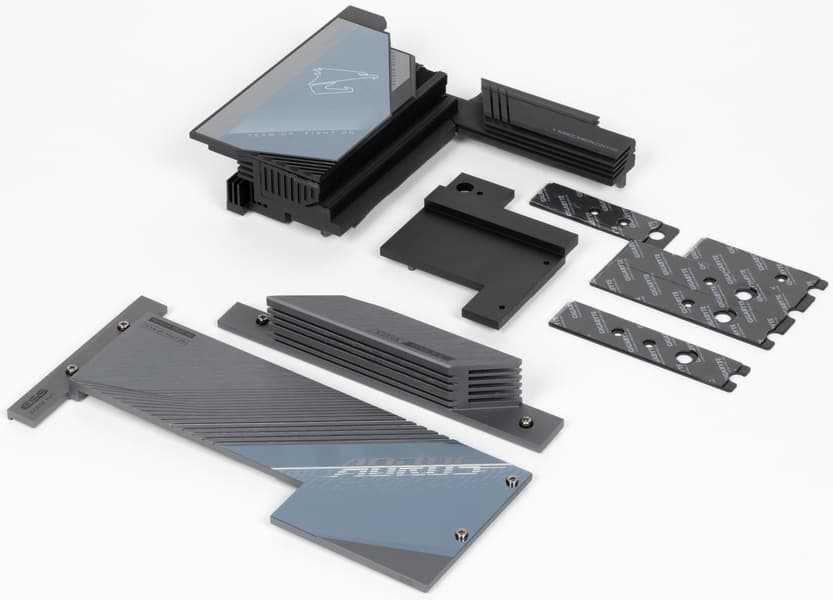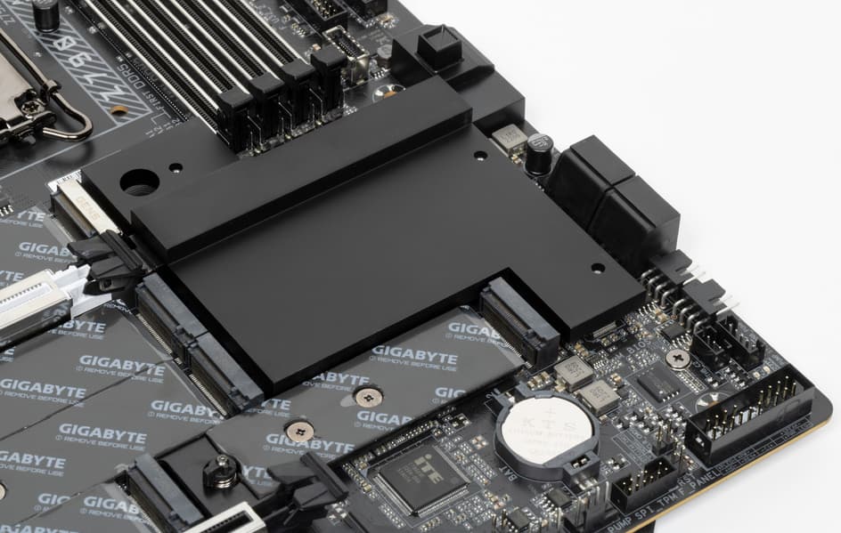 Все M.2 слоты имеют радиаторы. Верхний M2C_CPU обладает отдельным мощным радиатором, когда как остальные все слоты M.2 имеют общий радиатор.