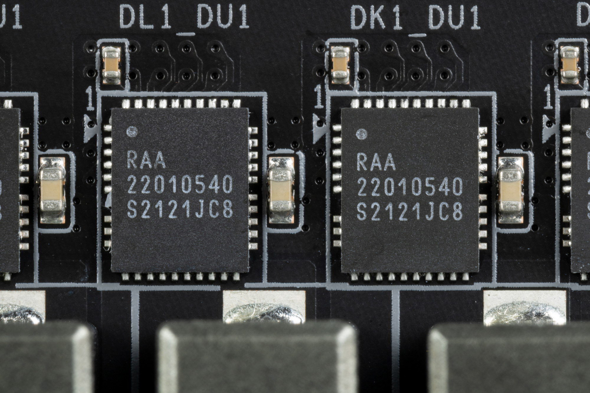 Каждый канал фазы имеет суперферритовый дроссель и RAA22010540 DrMOS от Renesas на 105 А.