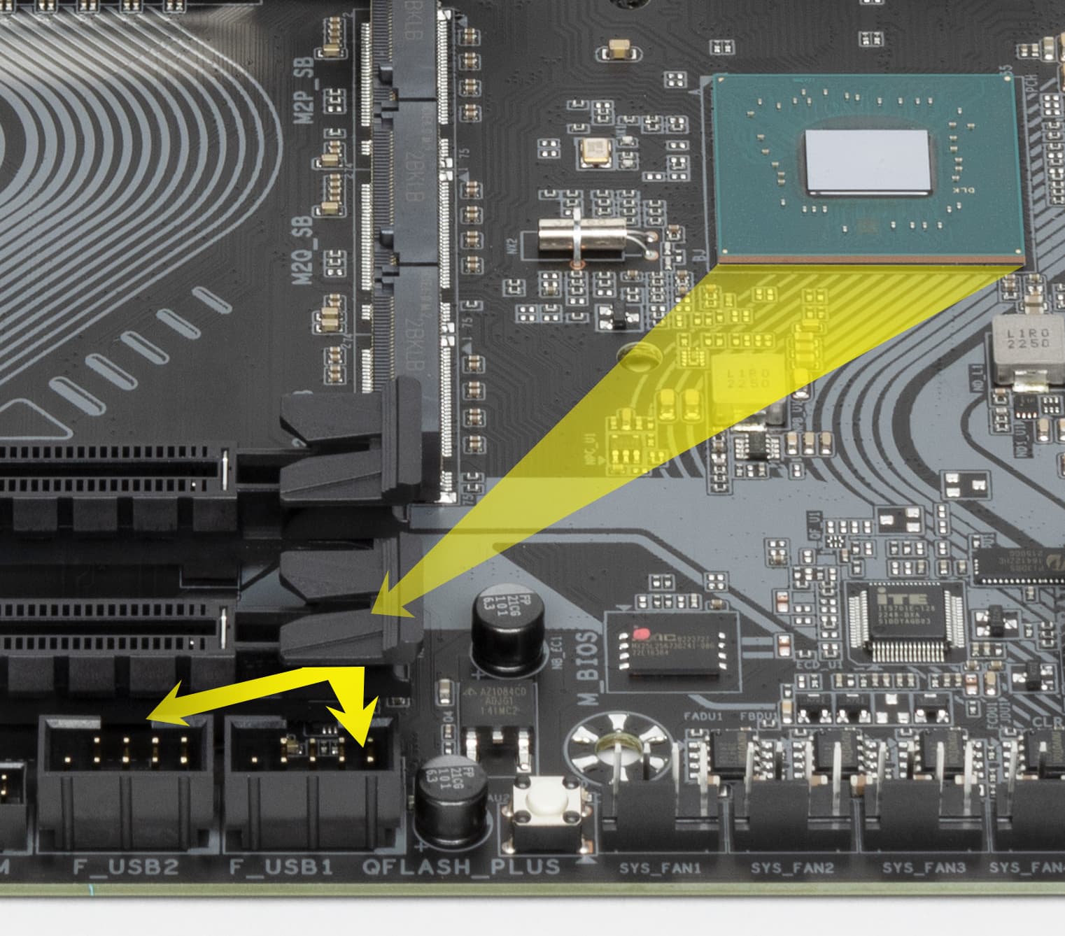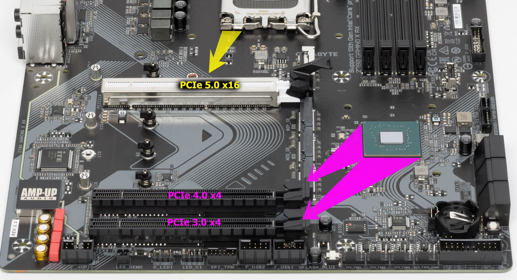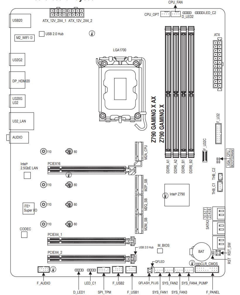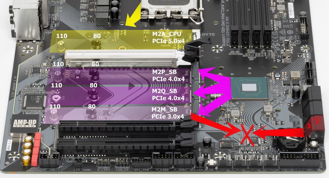 Второй, третий и четвертый слоты M.2 (M2Q_SB, M2P_SB, M2M_SB) получают данные от чипсета Z790, а первый M2A_CPU — от CPU, получая от процессора PCIe 4.0.
