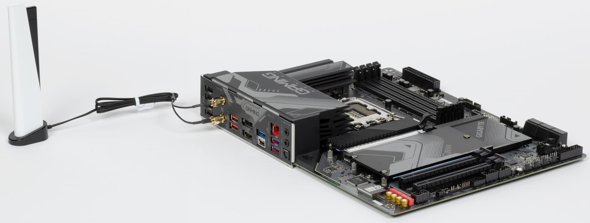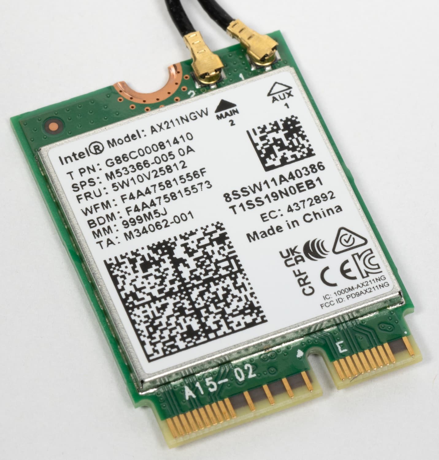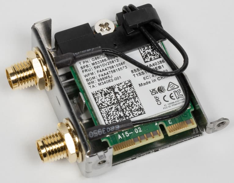 Имеется и комплексный беспроводной адаптер на контроллере Intel AX211NGW, через который реализованы Wi-Fi 6E (802.11a/b/g/n/ac/ax) и Bluetooth 5.2. Он установлен в слот M.2 (E-key), и его разъемы для привинчивания выносных антенн выведены на заднюю панель.