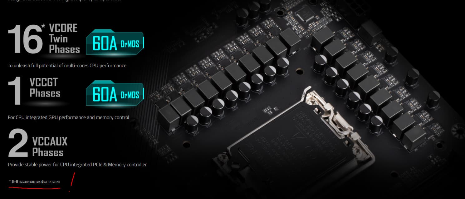 Управляет схемой ШИМ-контроллер NCP81530 от On Semi, он рассчитан максимум на 10 фаз. Поэтому фактически идет параллельная обработка 16-ти фаз питания VCore: 8+8, и в целом получается (8*2) VCore+1 iGPU = 9 фаз.