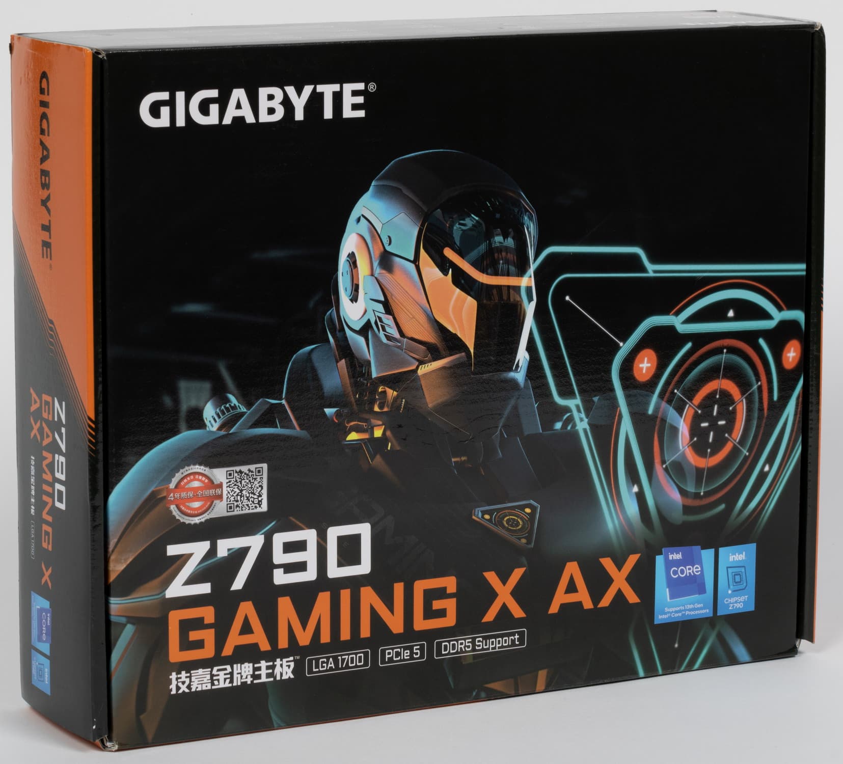 Gigabyte Z790 Gaming X AX поставляется в стандартной коробке с фирменной оранжево-черной раскраской. Комплект размещен под платой в отдельном отсеке.