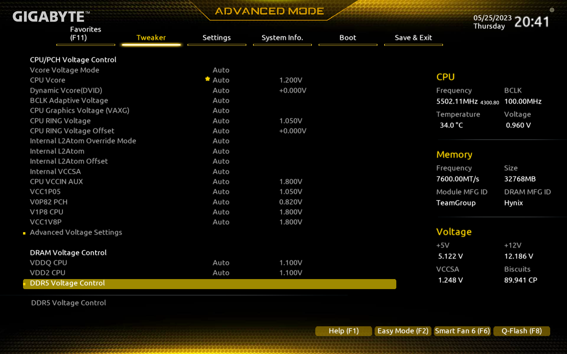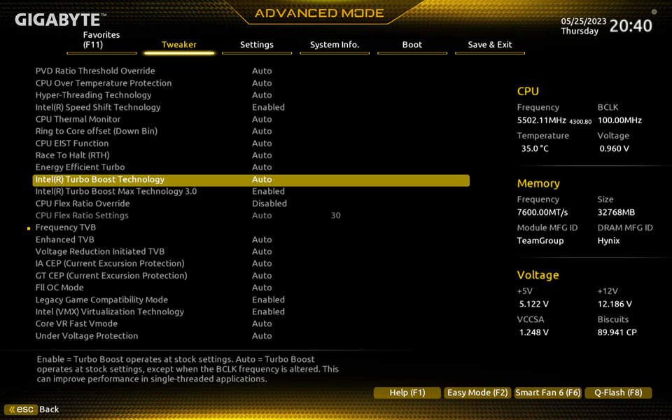 В режиме авторазгона мы получили от 5 до 5,5 ГГц по P-ядрам, и 4.3 ГГц по всем Е-ядрам. Напомню, что Р-ядра — это обычные всем привычные ядра, имеющие по 2 потока каждый, «Р» — означает Performance, то есть производительные. «Е» — это энергоэффективные ядра, так называемые, малые ядра, у них по 1 потоку.