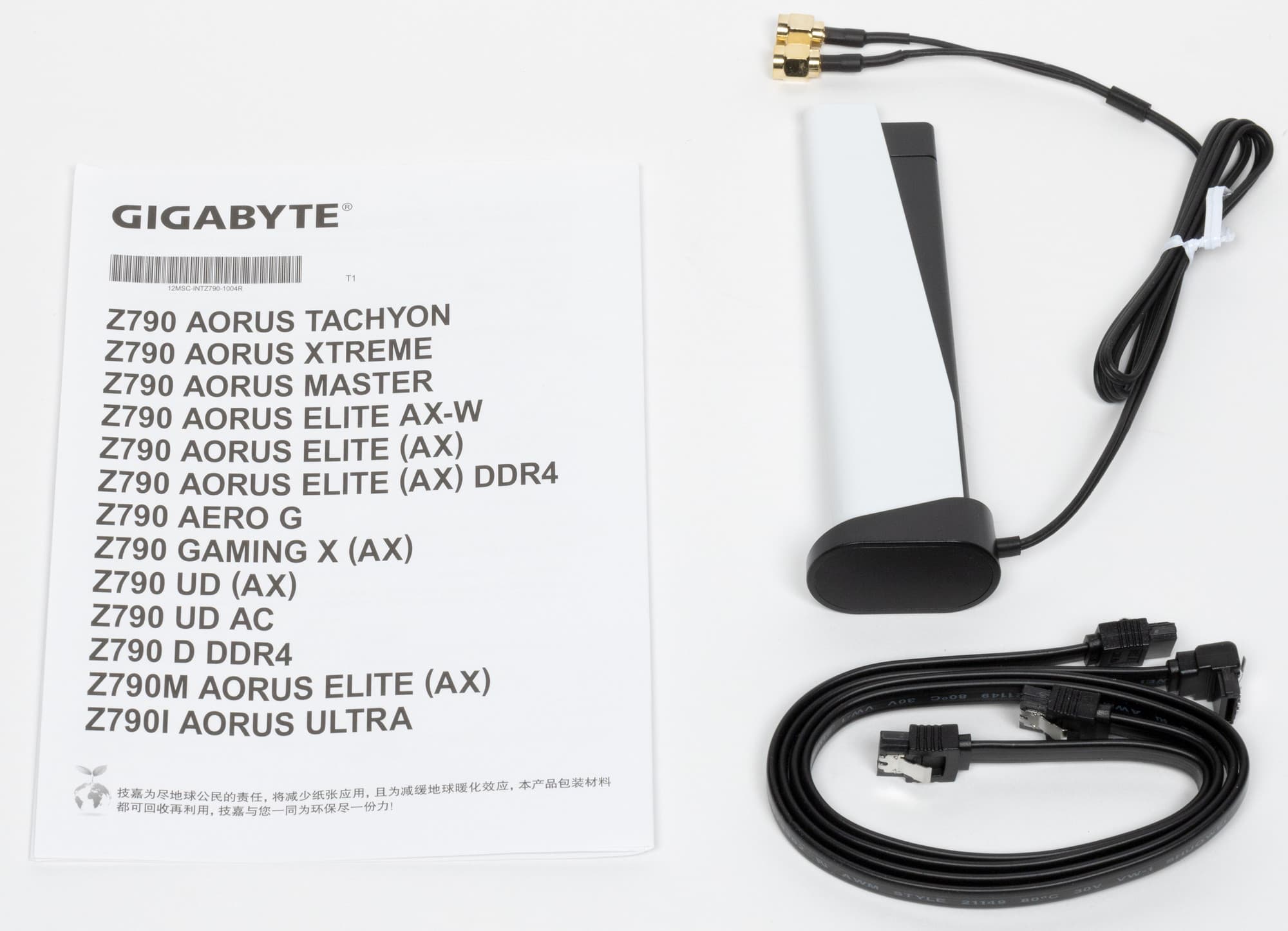 Комплект поставки очень скромен: кроме традиционных элементов типа руководства пользователя и кабелей SATA, имеется только антенна встроенного Wi-Fi-модуля.