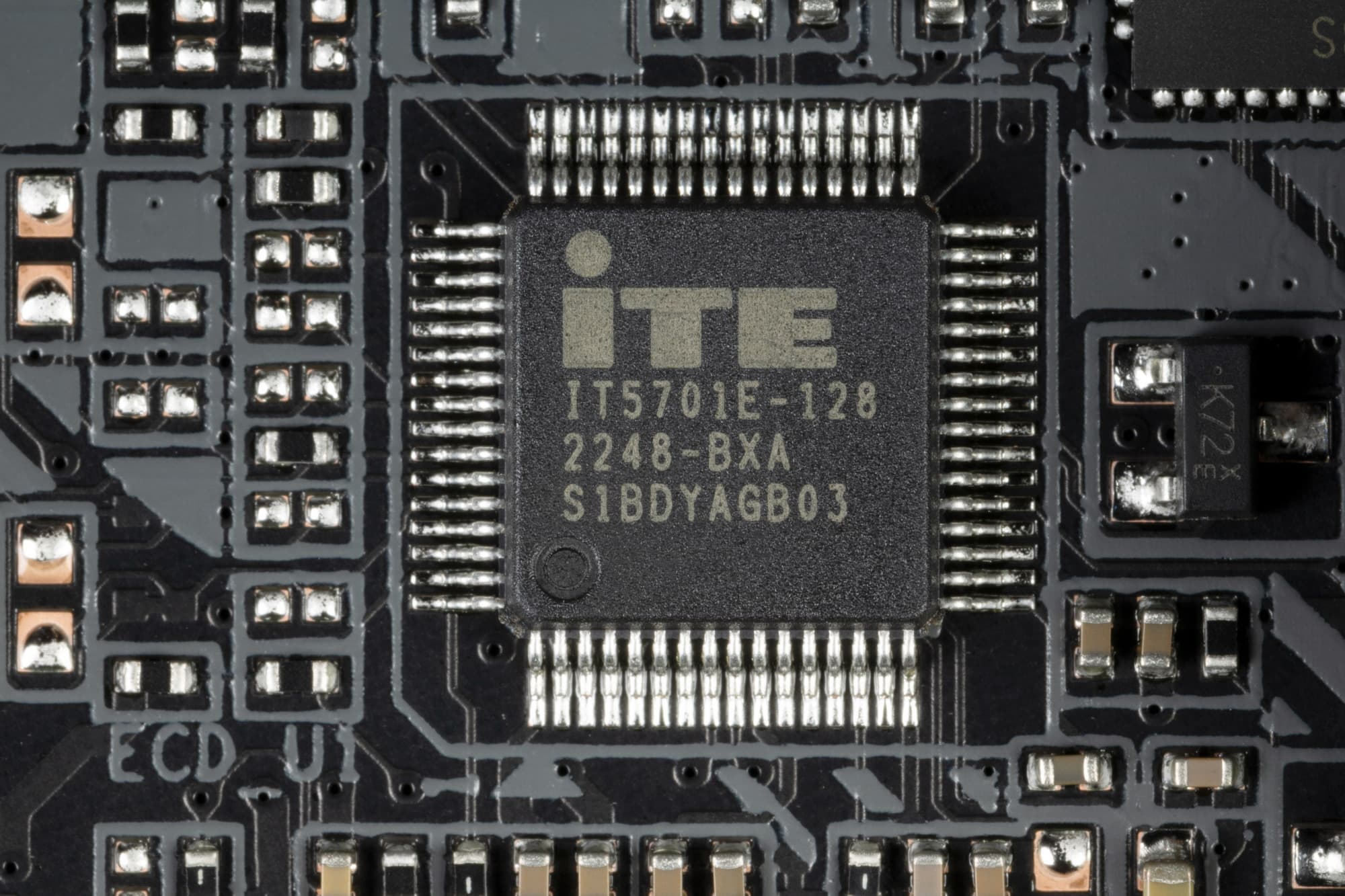 На оборотной стороне практически ничего нет. Текстолит обработан хорошо: во всех точках пайки не только острые концы срезаны, но и все неплохо отшлифовано. Бэкплейта нет.
