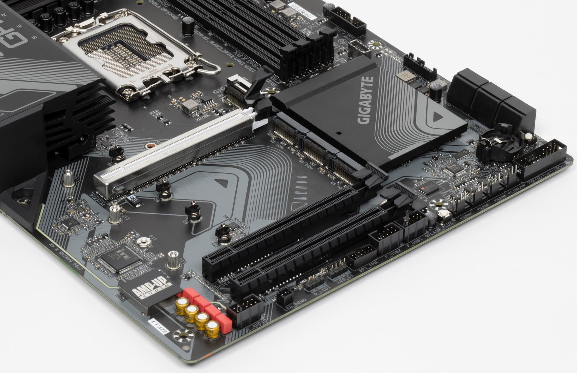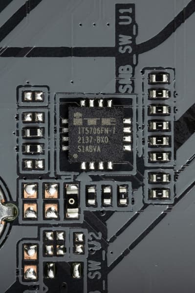 Плата относится к среднебюджетным решениям, поэтому нет ни внешнего тактового генератора, ни усилителей (ре-драйверов) сигнала PCIe 4.0/5.0.