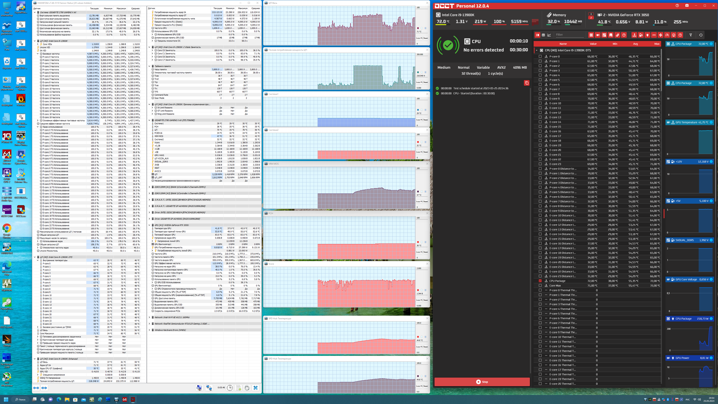 Скажу, что авторазгон не самый высокий, что мы видели ранее. Да, система по умолчанию, определив мощное питание матплаты, выставила приличные частоты, но я видел и 5,5 ГГц по всем P-ядрам. Что касается остальных параметров работы компонентов по нагреву, то все они были в норме. Потребление CPU переваливало за 220 Вт.