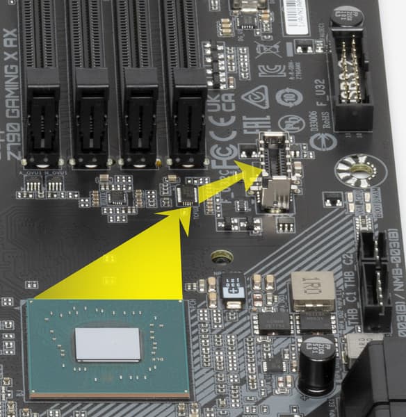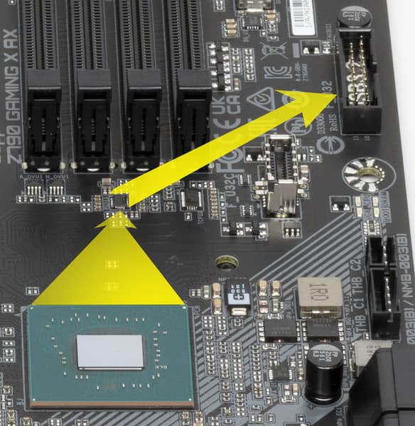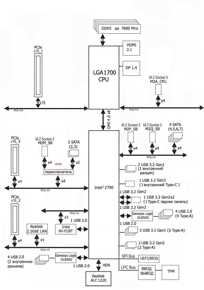 Процессоры Intel Core 13/12-го поколений (совместимые с сокетом LGA1700 и поддерживаемые Z790) имеют 20 линий ввода-вывода (16 PCIe 5.0, 4 PCIe 4.0), не имеют USB и SATA портов. При этом взаимодействие с Z790 идет по особому каналу Digital Media Interface 4.0 (DMI 4.0 x8). Все PCIe линии процессора идут на слоты расширения PCIe и порт М.2. Serial Peripheral Interface (SPI) используется для взаимодействия с системой UEFI/BIOS, а шина Low Pin Count (LPC) — для связи с устройствами ввода/вывода, не требующими высокой пропускной способности (контроллерами вентиляторов, TPM, старой периферии).