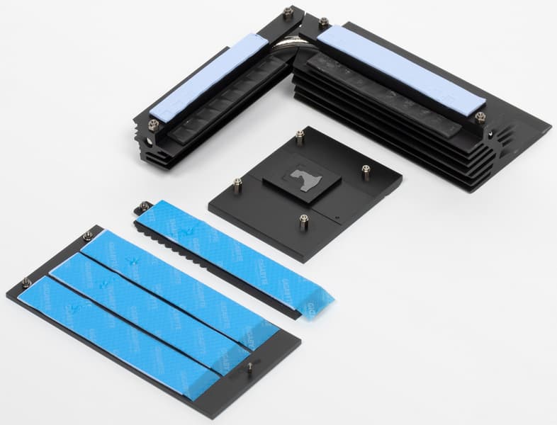 Как мы видим, охлаждение чипсета (один радиатор) организовано отдельно от силовых преобразователей. VRM-секция имеет свои два радиатора, соединенные тепловой трубкой под прямым углом.