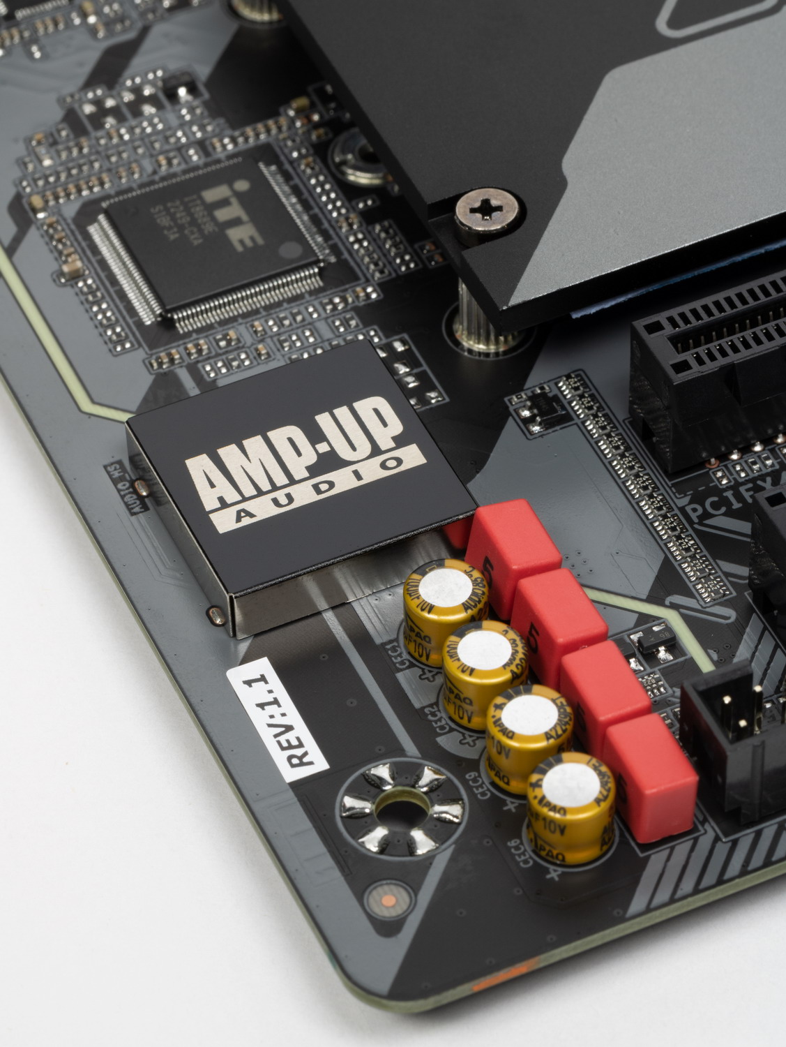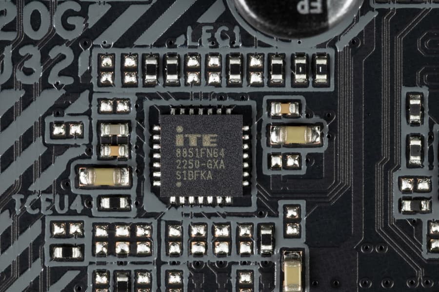 Мы знаем, что уже достаточно давно в большинстве современных материнских платах звуком заведовал аудиокодек Realtek ALC1220. В целом обеспечивает вывод звука по схемам до 7.1 с разрешением до 24 бит / 192 кГц. Мы видели уже и ALC4082 того же производителя с улучшенными характеристиками 32 бит / 384 кГц. Однако в данном случае мы видим возврат к прежнему ALC1220, а также схема вывода упрощена до 5.1. Сам чип накрыт металлической крышкой.