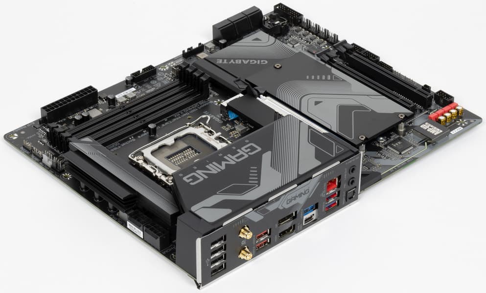 Форм-фактор ATX имеет размеры до 305×244 мм, а E-ATX — до 305×330 мм. Материнская плата Gigabyte Z790 Gaming X AX имеет размеры 305×244 мм, поэтому выполнена в форм-факторе ATX, и на ней имеются 9 монтажных отверстий для установки в корпус.