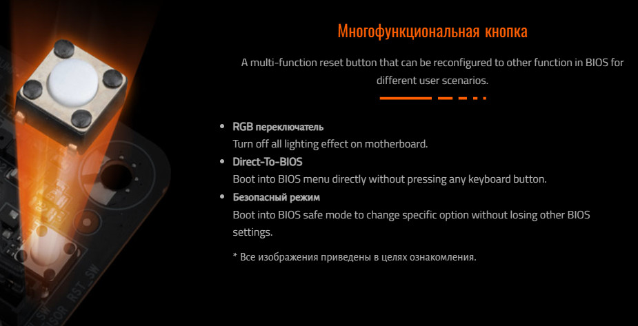 | Прочие внутренние элементы | 24-контактный разъем питания ATX 2 8-контактный разъем питания EPS12V 1 слот M.2 (E-key), занят адаптером беспроводных сетей 1 разъем для подключения порта USB 3.2 Gen2x2 Type-C 2 разъема для подключения 4 портов USB 3.2 Gen1 2 разъема для подключения 4 портов USB 2.0 10 разъемов для подключения 4-контактных вентиляторов и помп ЖСО 1 разъем для подключения неадресуемой RGB-ленты 4 разъема для подключения адресуемой ARGB-ленты 1 разъем аудио для передней панели корпуса 1 разъем для датчика шума 2 разъема для термодатчиков 1 разъем для сброса CMOS 1 разъем для устройств безопасности TPM 1 конфигурируемый разъем Reset 1 разъем для подключения управления с передней панели корпуса 1 кнопка включения питания Power 1 конфигурируемая кнопка перезагрузки Reset |