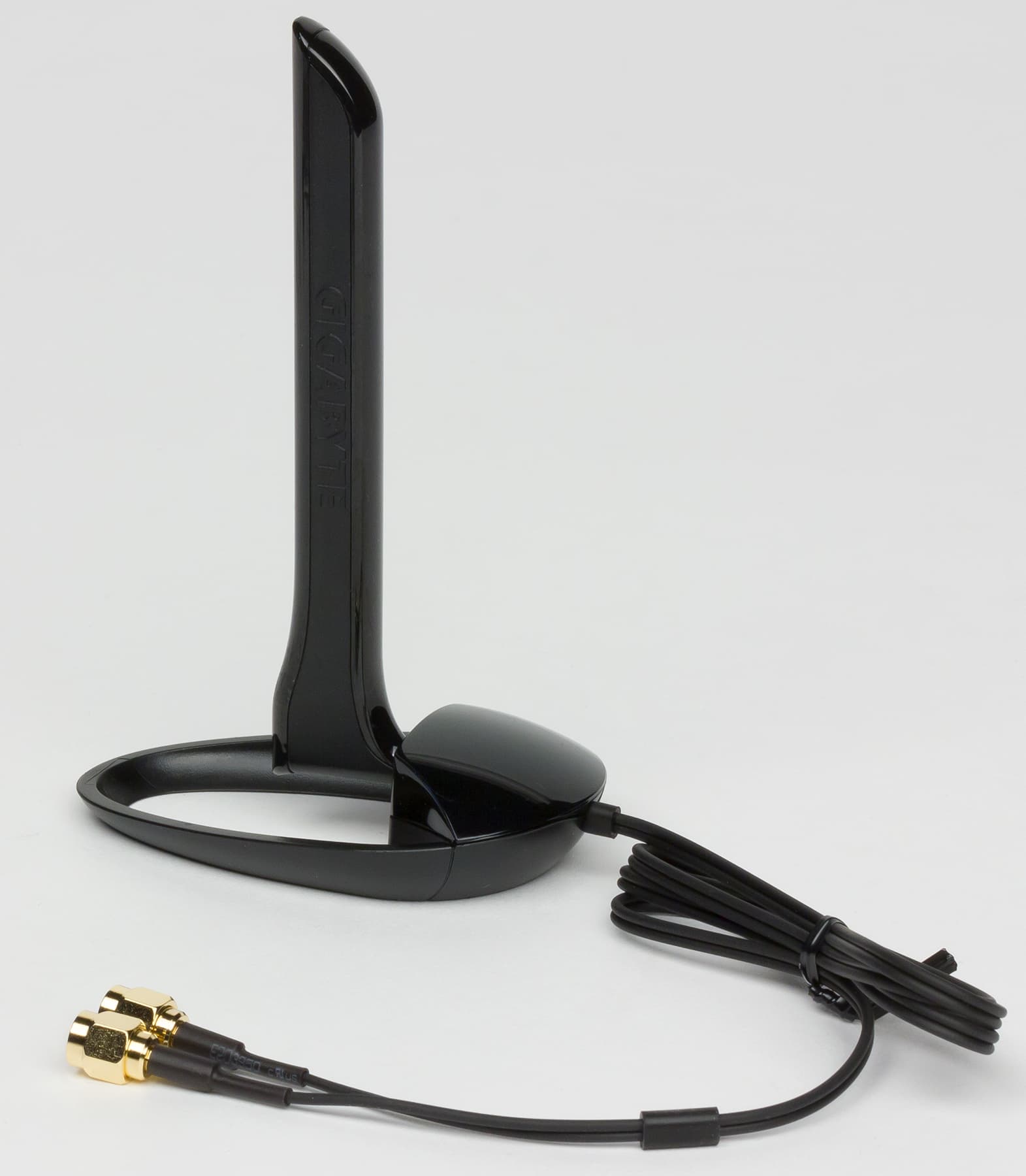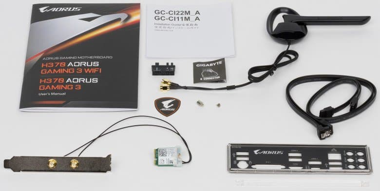 Комплект поставки включает в себя руководство пользователя, два SATA-кабеля (все разъемы с защелками, два кабеля имеет угловой разъем с одной стороны), заглушку для задней панели платы и G-коннектор для облегчения подключения проводов от фронтальной панели корпуса к плате, а также эмблему, наклеиваемую на корпус с логотипом Aorus, и Wi-Fi-модуль с антенной.