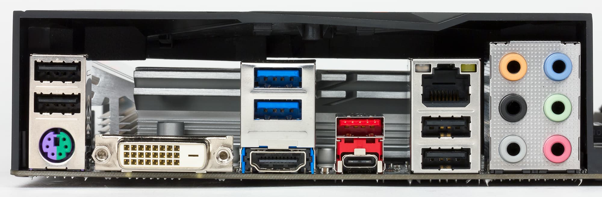 | Разъемы на задней панели | 2 × USB 3.0 (Type-A) 4 × USB 2.0 (Type-A) 1 × USB 3.1 (Type-C) 1 × USB 3.1 (Type-A) 1 × HDMI 1 × DVI-D 1 × RJ-45 1 × PS/2 6 аудиоразъемов типа миниджек (3,5 мм) |