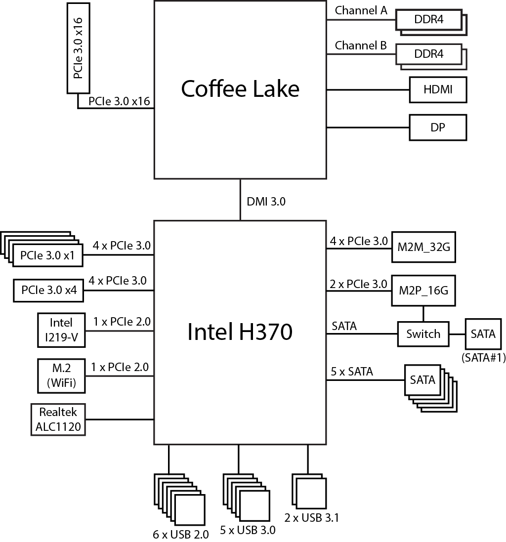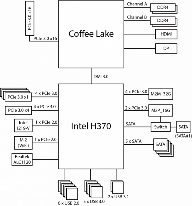 Чипсет Intel H370 имеет 30 высокоскоростных портов ввода/вывода (HSIO), в качестве которых могут быть порты PCIe 3.0, USB 3.0/3.1 и SATA 6 Гбит/с. Часть портов строго фиксированы, но есть HSIO-порты, которые могут конфигурироваться как USB 3.0/3.1 или PCIe 3.0, SATA или PCIe 3.0. Причем всего может быть не более 8 портов USB 3.0 и не более 4 портов USB 3.1, но так, чтобы в сумме было не более 8 портов USB 3.1/USB 3.0, а общее количество USB-портов (включая USB 2.0) не превосходило 14. Кроме того, должно быть не более 6 портов SATA и не более 20 портов PCIe 3.0.