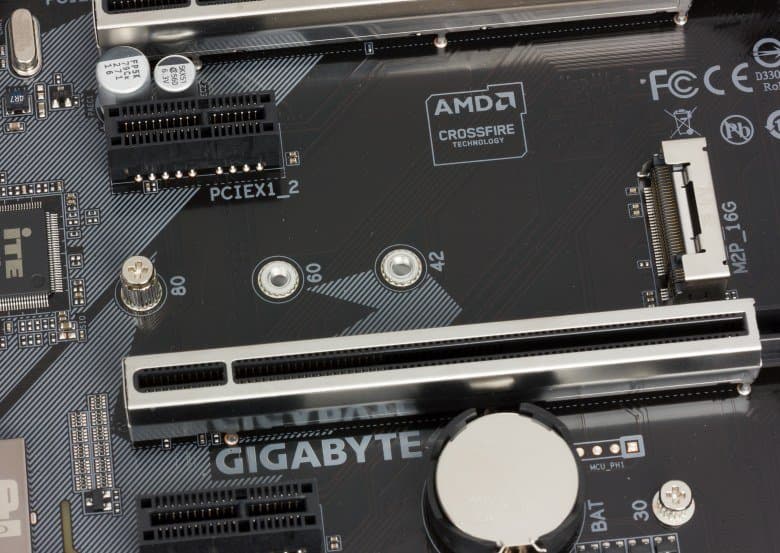 Первый (если считать от процессорного разъема) слот с форм-фактором PCI Express x16 реализован на базе процессорных линий PCIe 3.0 и представляет собой слот PCI Express 3.0 x16. Второй слот с форм-фактором PCI Express x16 реализован на базе чипсетных линий PCIe 3.0, и работает на скорости x4, то есть представляет собой слот PCI Express 3.0 x4 в форм-факторе PCI Express x16. Естественно, плата не поддерживает технологию Nvidia SLI и допускает лишь объединение двух видеокарт по технологии AMD CrossFireX (в несимметричном режиме).