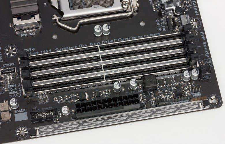 Для установки модулей памяти на плате H370 Aorus Gaming 3 WiFi предусмотрено четыре DIMM-слота. Плата поддерживает небуферизованную память DDR4 (non-EСС), а максимальный объем памяти составляет 64 ГБ (при использовании модулей емкостью по 16 ГБ).