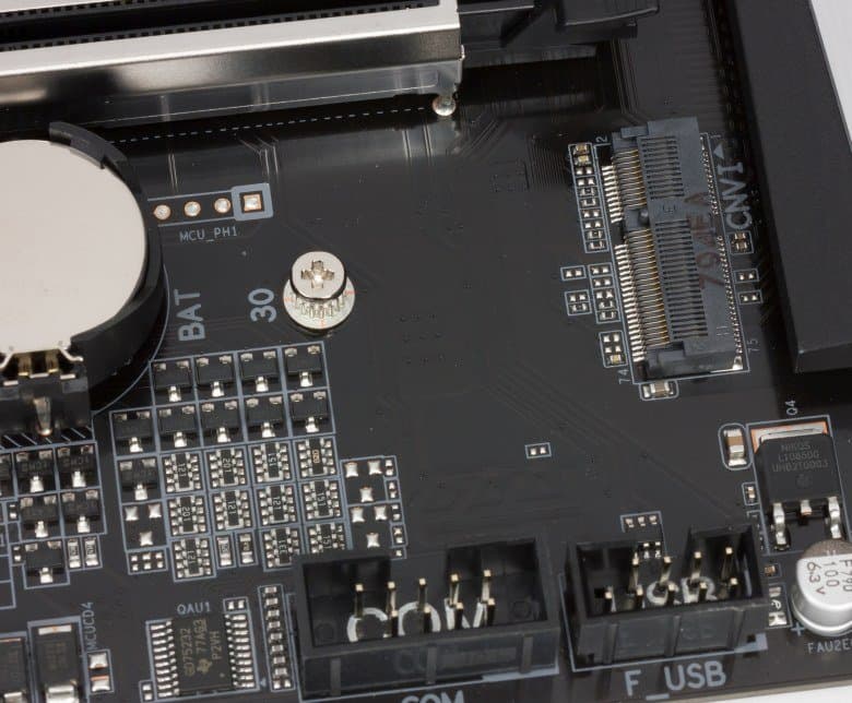 Еще один разъем M.2 (CNVI) предназначен для установки Wi-Fi-модуля, который поставляется в комплекте с платой. Этот разъем обеспечивает интерфейс PCIe x1.