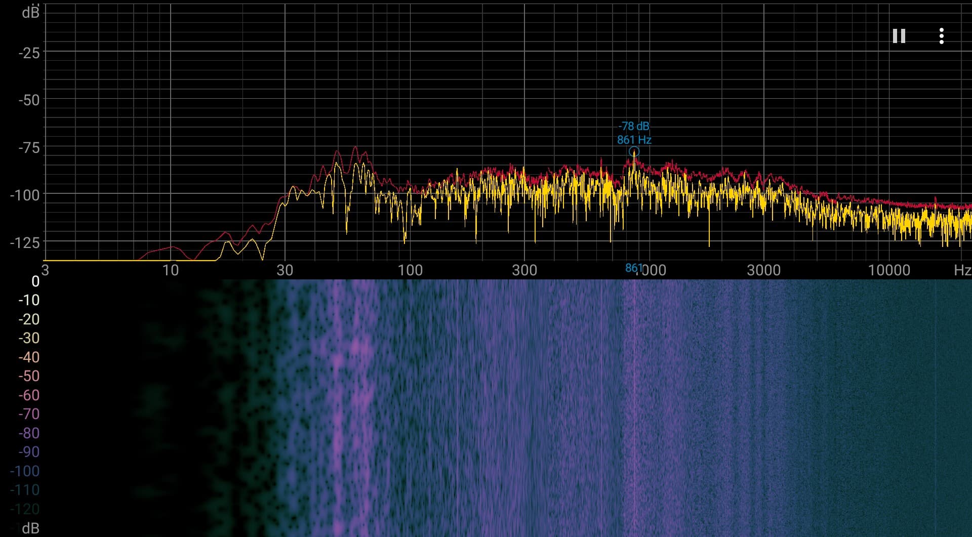 В целом этот ПК не является шумным устройством. Характер шума ровный и раздражения не вызывает. Спектрограмма, полученная под максимальной нагрузкой на процессор, достаточно ровная, и в диапазоне частот, где звуки могут вызывать особенное раздражение, пиков с высокой интенсивностью нет (низкочастотными пиками можно пренебречь):