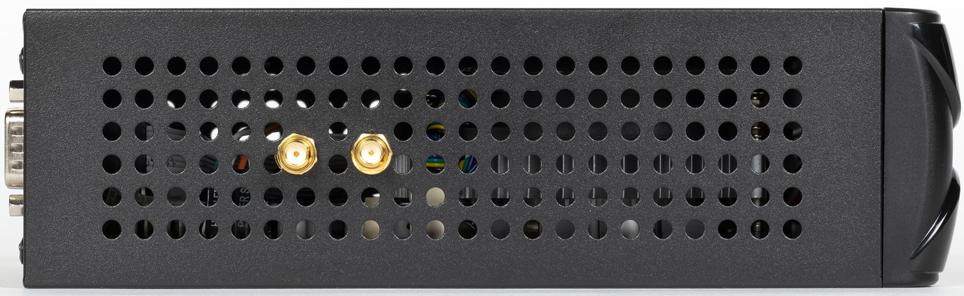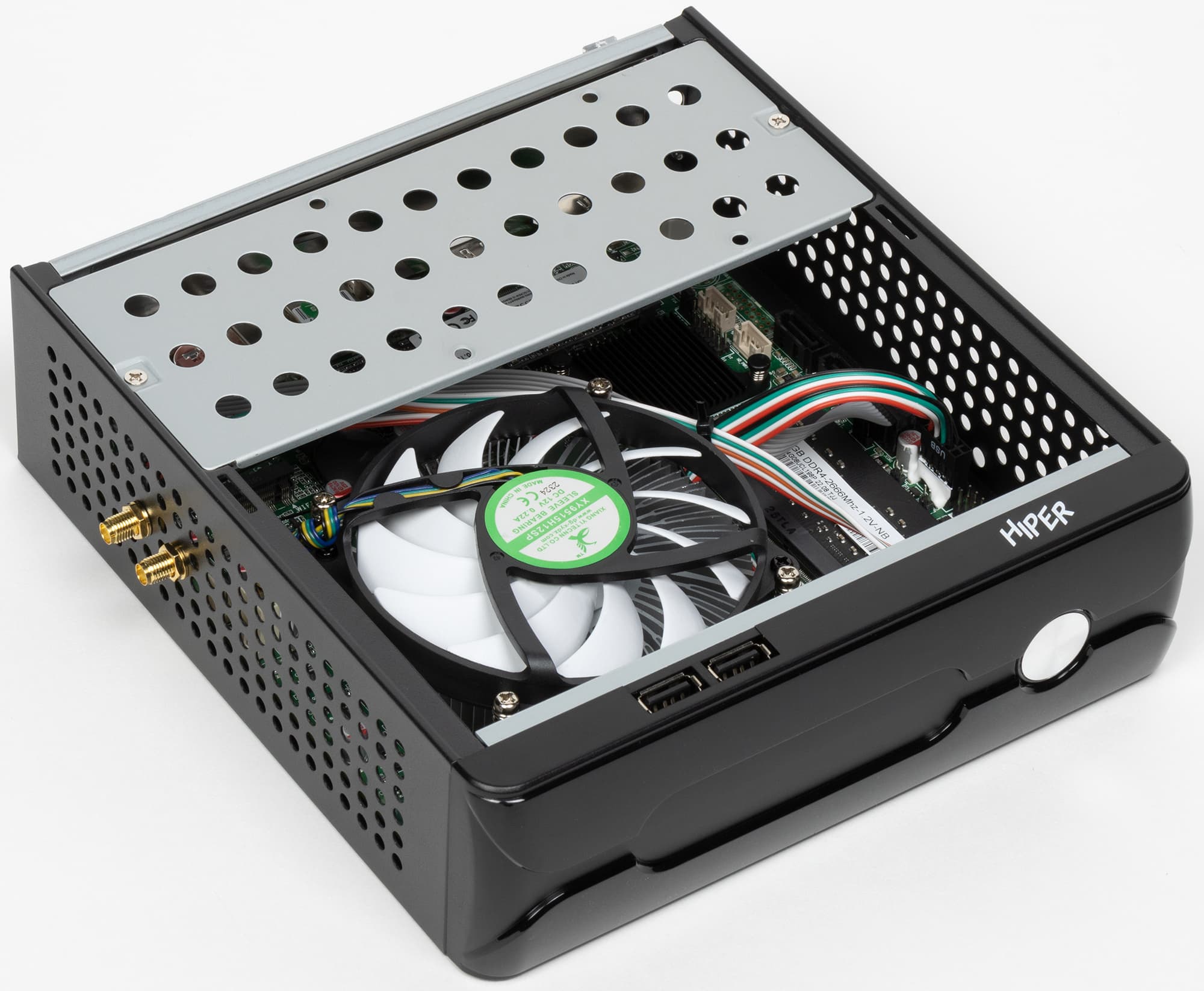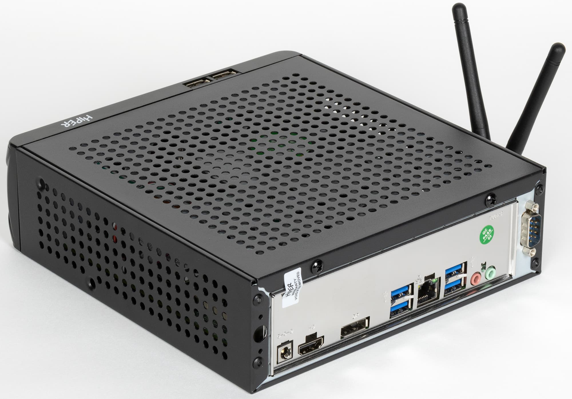 Глухой является только нижняя крышка — но ее перфорировать и нет смысла, поскольку либо будет лежать прямо на столе (ножки здесь не предусмотрены), либо крепиться к монитору/телевизору. Хотя в принципе на столе компьютер устойчиво стоит и на боковой грани. Одной из граней — на вторую выведены разъемы под антенны.