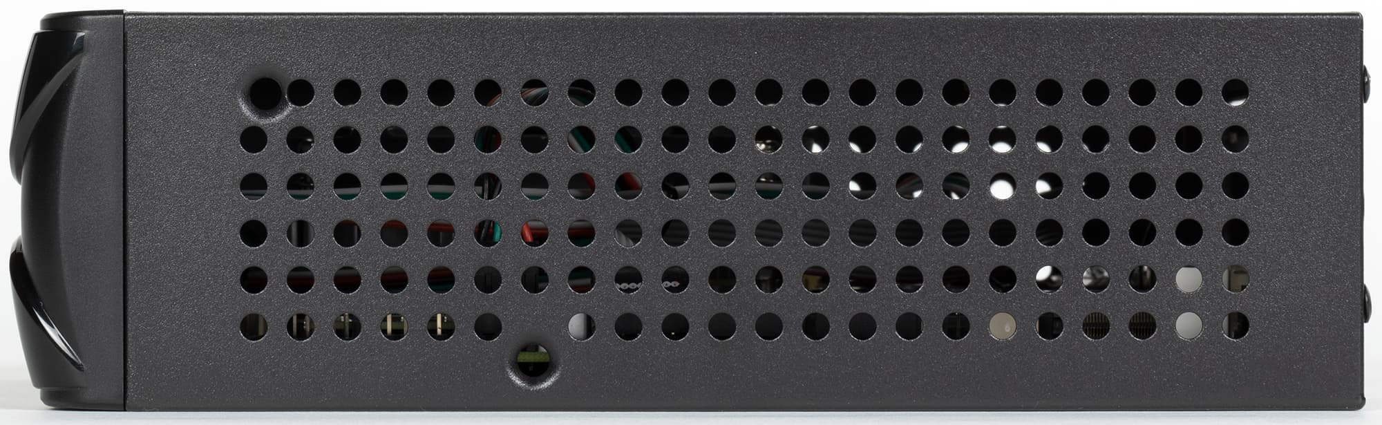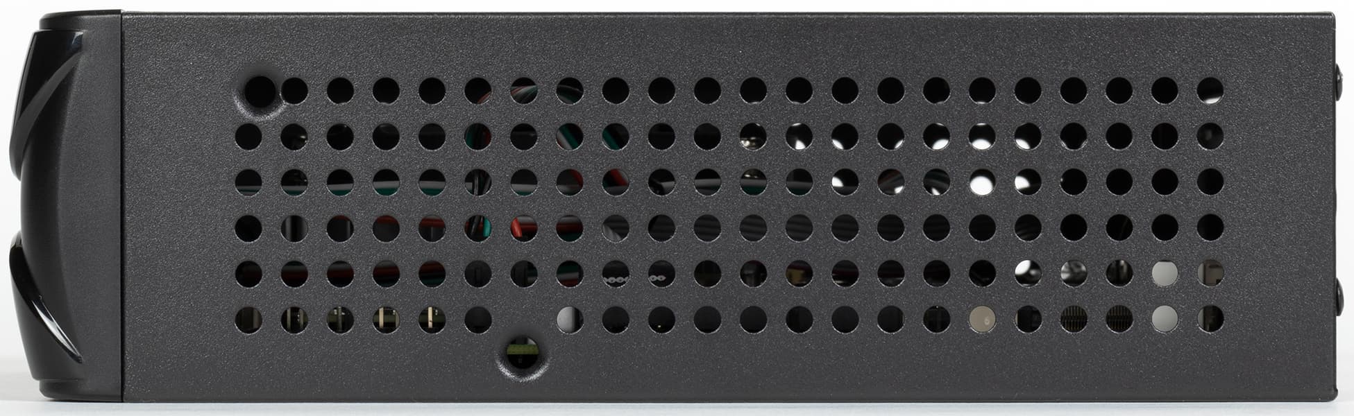 Поэтому здесь имеем коробочку размерами 20×20 и толщиной 6 см. Причем все цифры логически обусловлены: платы Mini-ITX (самые маленькие из еще неэкзотических) имеют размеры 17×17 см плюс небольшие «зазоры» надо оставить, а толщина такова, чтоб в корпус нормально помещались недорогие массовые охладители — начиная с боксовых и иже с ними. Подход достаточно утилитарный — зато недорогой и работающий. Равно как и огромное количество больших отверстий в корпусе — пыль в него будет попадать неизбежно, так что иногда придется чистить, но в условиях настольно-офисного использования это не критично. Зато небольшими средствами достигается хороший теплообмен с окружающей средой, причем практически по всему объему корпуса.