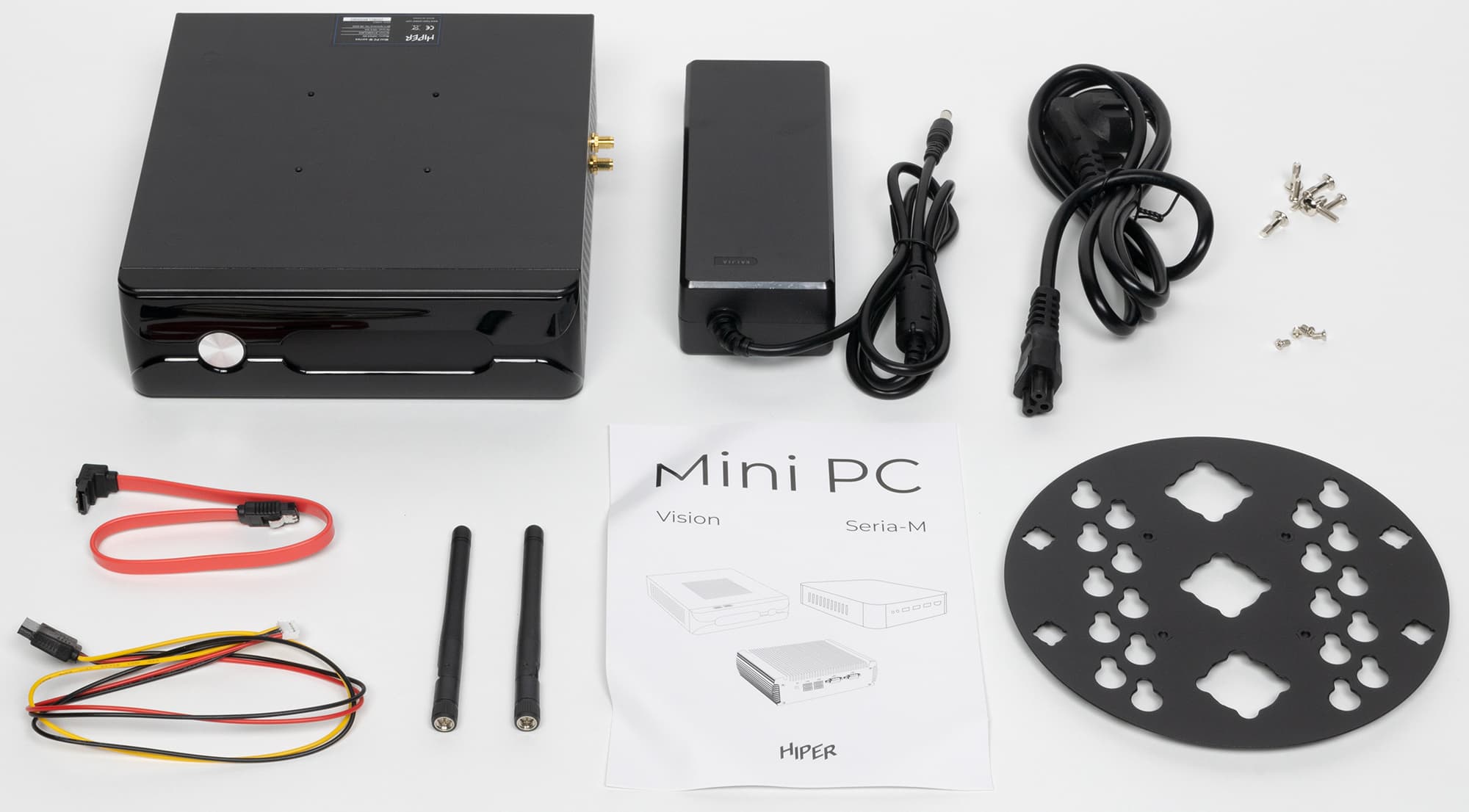 В который, как и положено, включено не только всё необходимое, но и то, что может пригодиться в случае модернизации. Например, комплект из двух кабелей для подключения дополнительного SATA-накопителя, а также винтики для его фиксации в корпусе. Или VESA-крепление для того, чтобы повесить компьютер сзади монитора или телевизора.