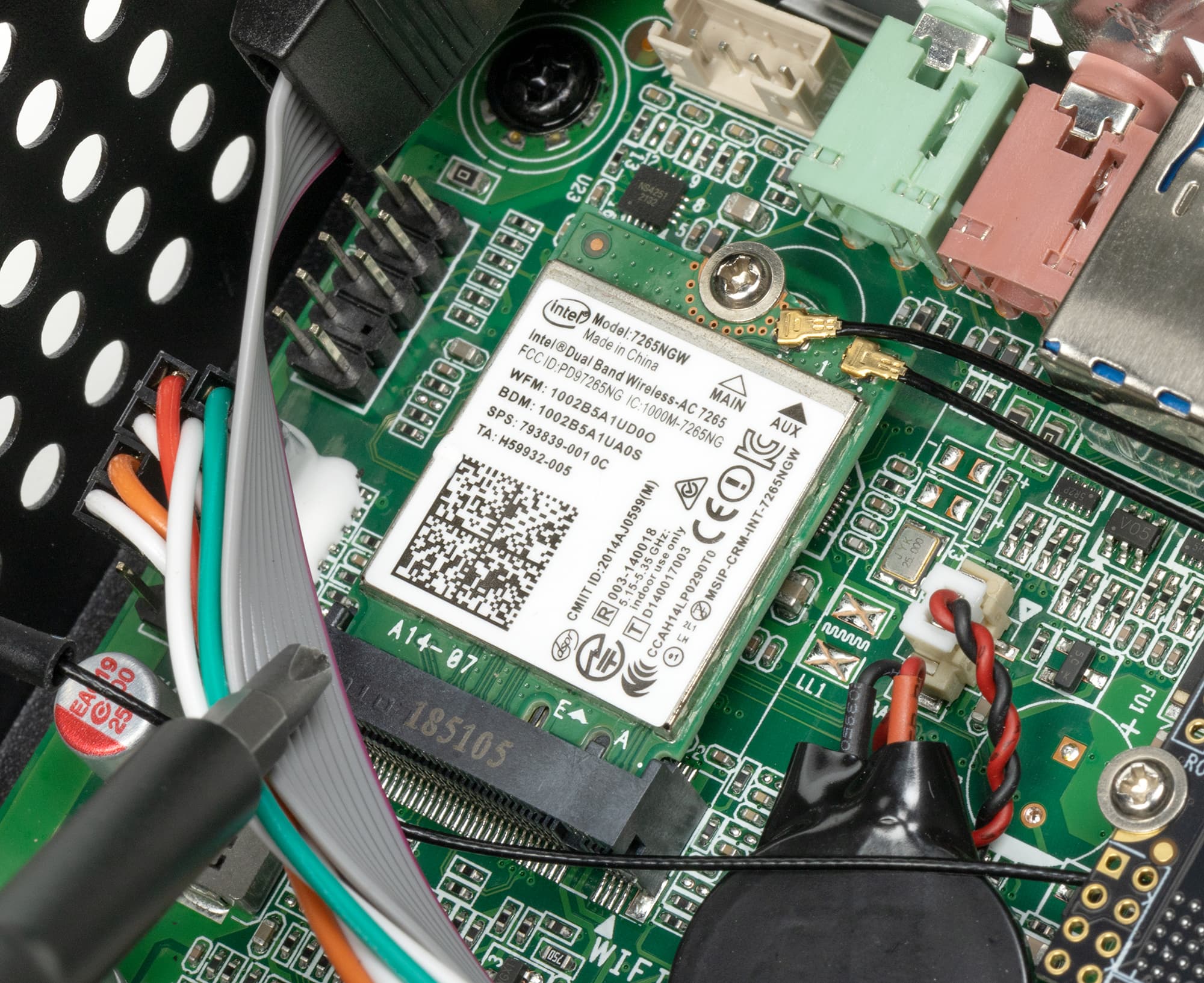 То же самое касается и беспроводного адаптера — одинакового во всех конфигурациях: Intel Wireless AC 7265 с поддержкой Wi-Fi 5 (на сегодня практически все еще стандарт де-факто) и Bluetooth 4.2. В принципе, многие вообще до сих пор полагаются в первую очередь на провода (особенно в офисах), так что можно было бы обойтись и без него. Но на цену влияет не сильно, и иногда наличие штатного беспроводного модуля само по себе полезно — так что лучше его штатно и устанавливать. А если скорости мало станет — можно поменять. Он тоже просто установлен в слот М.2, а не распаян на плате.