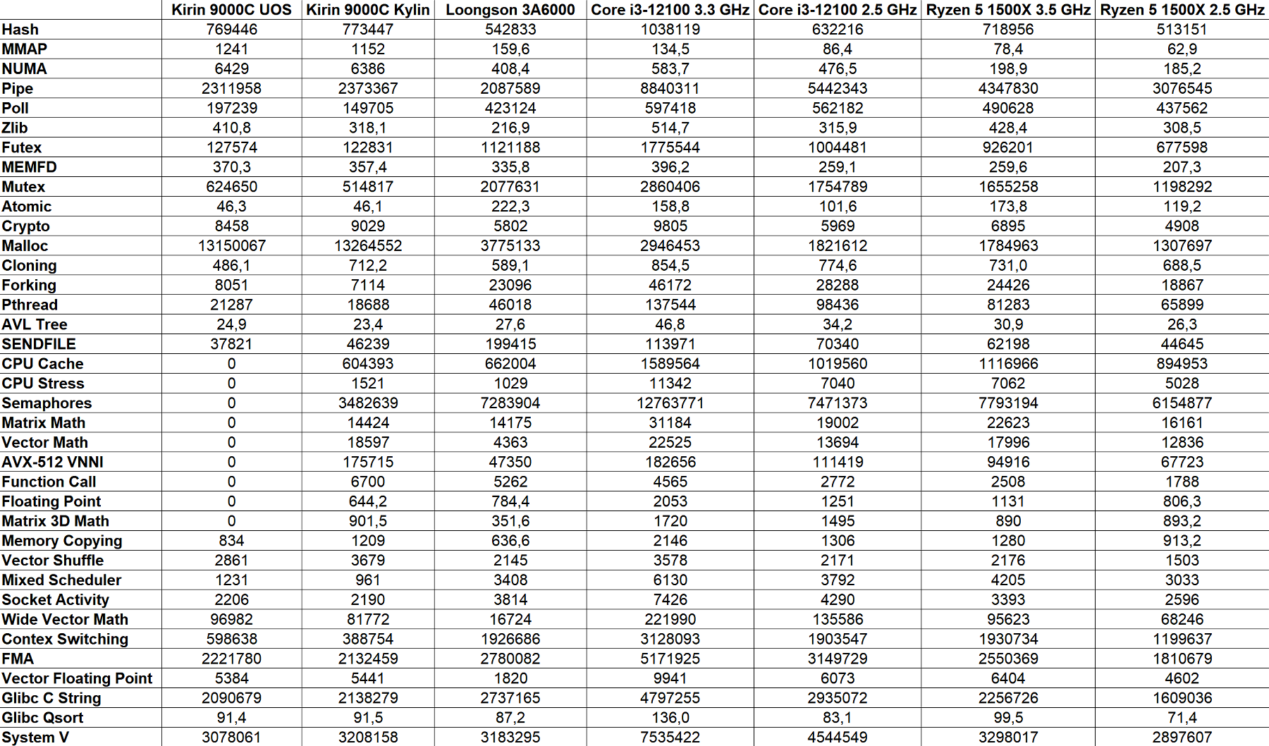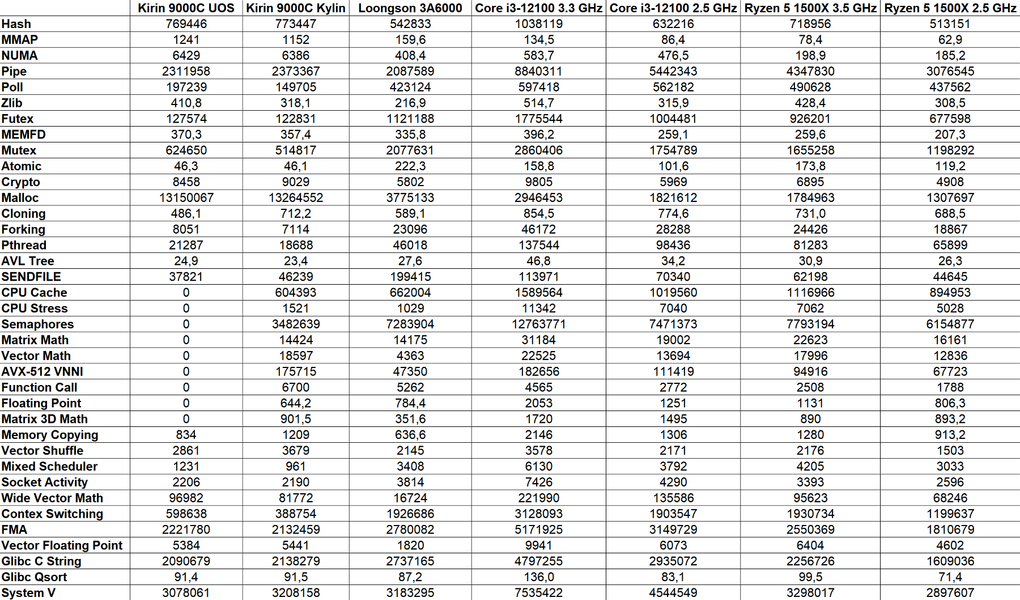 Сразу скажем, что нулевые показатели в последней колонке получились из-за недостатка памяти у системы на основе Kirin 9000C — у нее меньше памяти, чем у остальных систем: 8 ГБ против 16 ГБ, и для этого теста ее было недостаточно. По другим подтестам можно сказать, что вот тут Core i3-12100 уже не быстрейший, так как измеряется ПСП, а системы Intel и HiSilicon используют память DDR5, причем у Kirin 9000C она работает на более высокой частоте. Ryzen 5 1500X оказался явно медленнее китайского процессора, не говоря уже о Loongson, это объясняется памятью DDR4 у обоих.