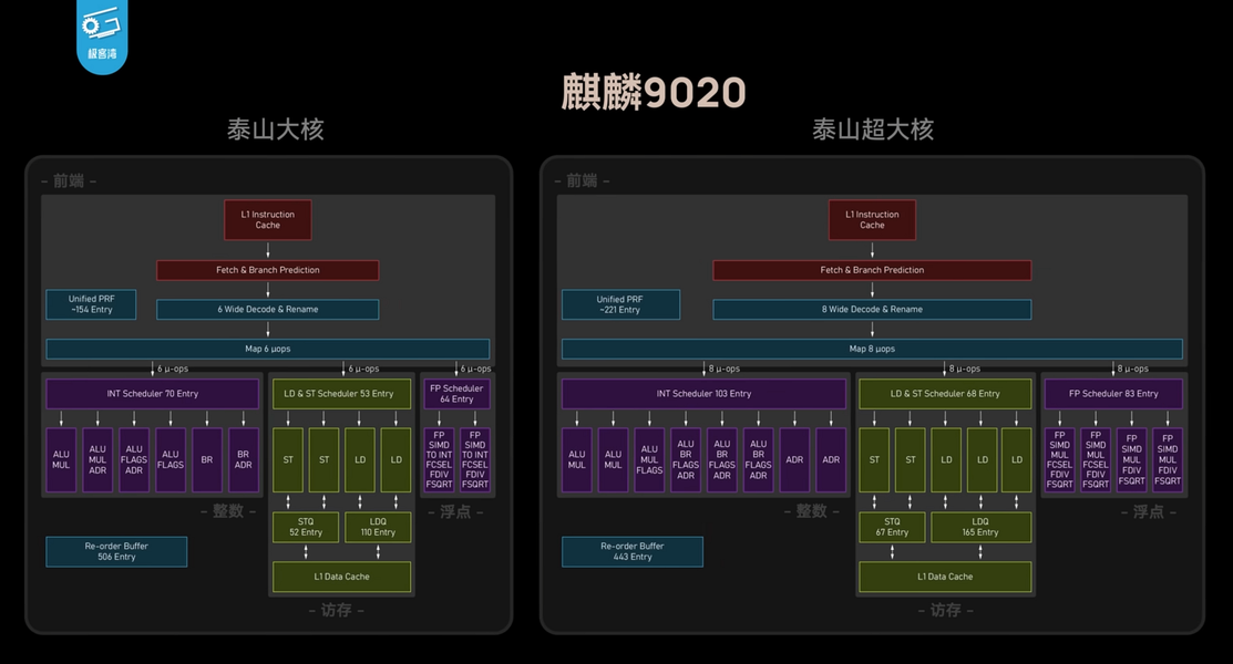 А вот анонсированный еще позднее Kirin 9010 уже имеет отличия в самих ядрах, там уже используются Taishan V121 с увеличенным количеством некоторых внутренних блоков, кэшей и очередей по сравнению с Taishan V120. Усложнение ядра привело к снижению его частоты, и для чуть улучшенного суперъядра в Kirin 9010 она ограничена еще сильнее — уже на уровне 2,35 ГГц. Если пойти еще чуть дальше, то по-настоящему заметное улучшение произошло уже в больших ядрах совсем свежего Kirin 9020, анонсированного в ноябре 2024 года — его суперъядро работает на частоте 2,50 ГГц и имеет более широкий декодер (8-wide против 6-wide), вдвое больше FP-блоков, а также большее количество многих других блоков и буферов вычислительного ядра. Кроме этого, в этом SoC даже самые маленькие ядра заменены решениями собственного дизайна, а не взятыми у ARM. Но не будем забегать вперед, сегодня мы исследуем Kirin 9000C годичной давности, который, скорее всего, схож со столь же устаревшим Kirin 9000S, поэтому мы рассматриваем их возможности.