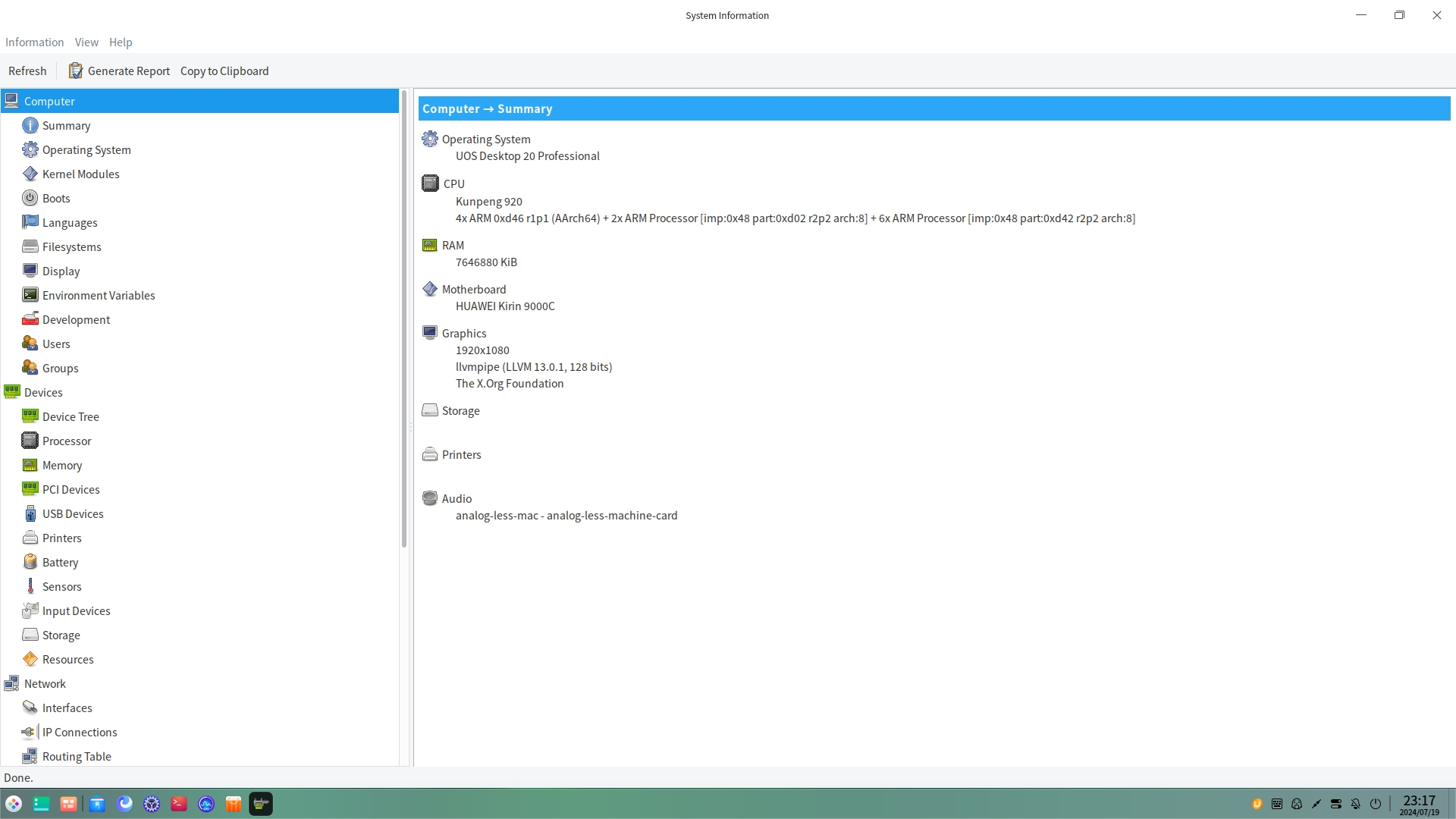 Кстати, производительность встроенного в Kirin 9000C видеоядра оказалась довольно близкой к тому, что мы видели на примере Loongson. В тесте GLmark2 при разрешении Full HD встроенный GPU в Loongson набирал в двухканальном режиме работы памяти 70 баллов, а GPU в Kirin — 88 в UOS и 74 в Kylin. Если рассматривать тест 2D-графики в утилите HardInfo, то это 1144 в UOS и 967 в Kylin против 4108 у Loongson. То есть многое зависит от ПО и степени оптимизации. В этом случае мы не пробовали установку дискретной видеокарты, так как не видим в этом особого смысла — в том числе из-за одного разъема PCIe x1.
