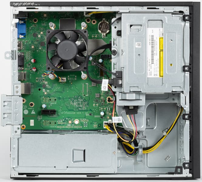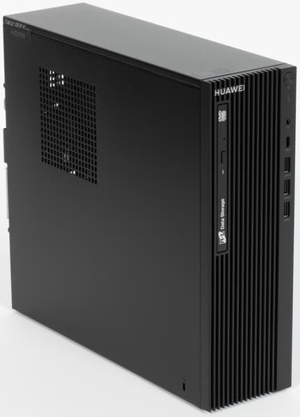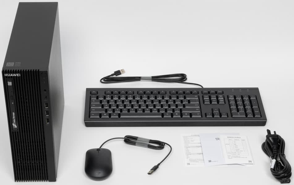 Хотя на корпусе есть три низкопрофильных слота для установки карт расширения, но системная плата предлагает лишь один слот PCIe 3.0 x1, подходящий для низкопрофильных карт расширения. Дополняет ПК вполне достаточный блок питания невысокой мощности, а компактный корпус достаточно удобный и просторный для столь простой системы. В комплекте поставляется проводная клавиатура Huawei K100 и проводная же мышь Huawei M100. Полностью поддерживаются операционные системы: Kylin OS или Tongxin UOS Desktop — возможна предустановка одной из них на выбор.