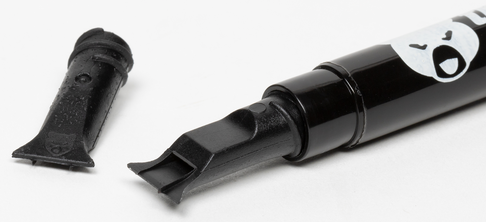 Зато сам шприц необычный. Он особой уплощенной формы. В верхней его части есть упоры для среднего и указательного пальцев, а нижняя часть закрывается колпачком с надежной фиксацией. Но самая главная особенность шприца в его носике, работающим как аппликатор для удобного и быстрого нанесения термопасты на крышку процессора тонким и равномерным слоем. Достигается это за счет того, что выходное отверстие на носике представляет собой узкую щель шириной 12 мм, с одной стороны которой есть скос, помогающий удерживать шприц под нужным углом, а на другой стороне — зубчики, распределяющие термопасту по всей ширине щели носика.