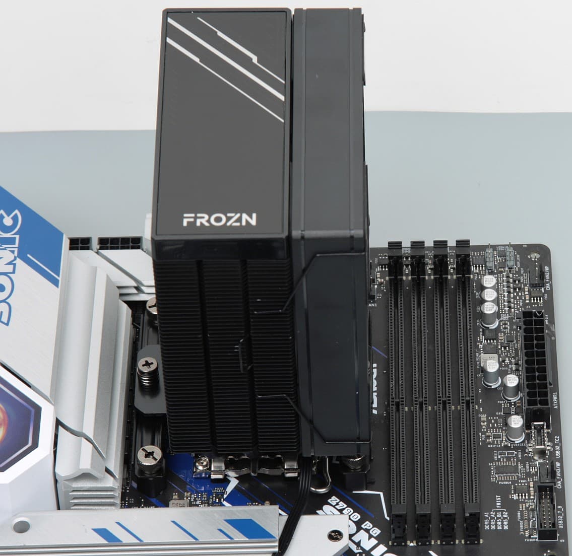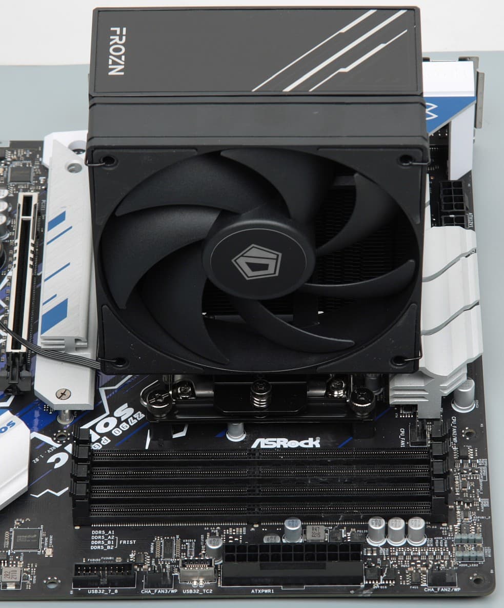 Глубина кулера небольшая и радиатор немного смещен от центра, поэтому все разъемы для оперативной памяти сверху не перекрываются. Например в случае материнской платы ASRock Z790 PG Sonic:
