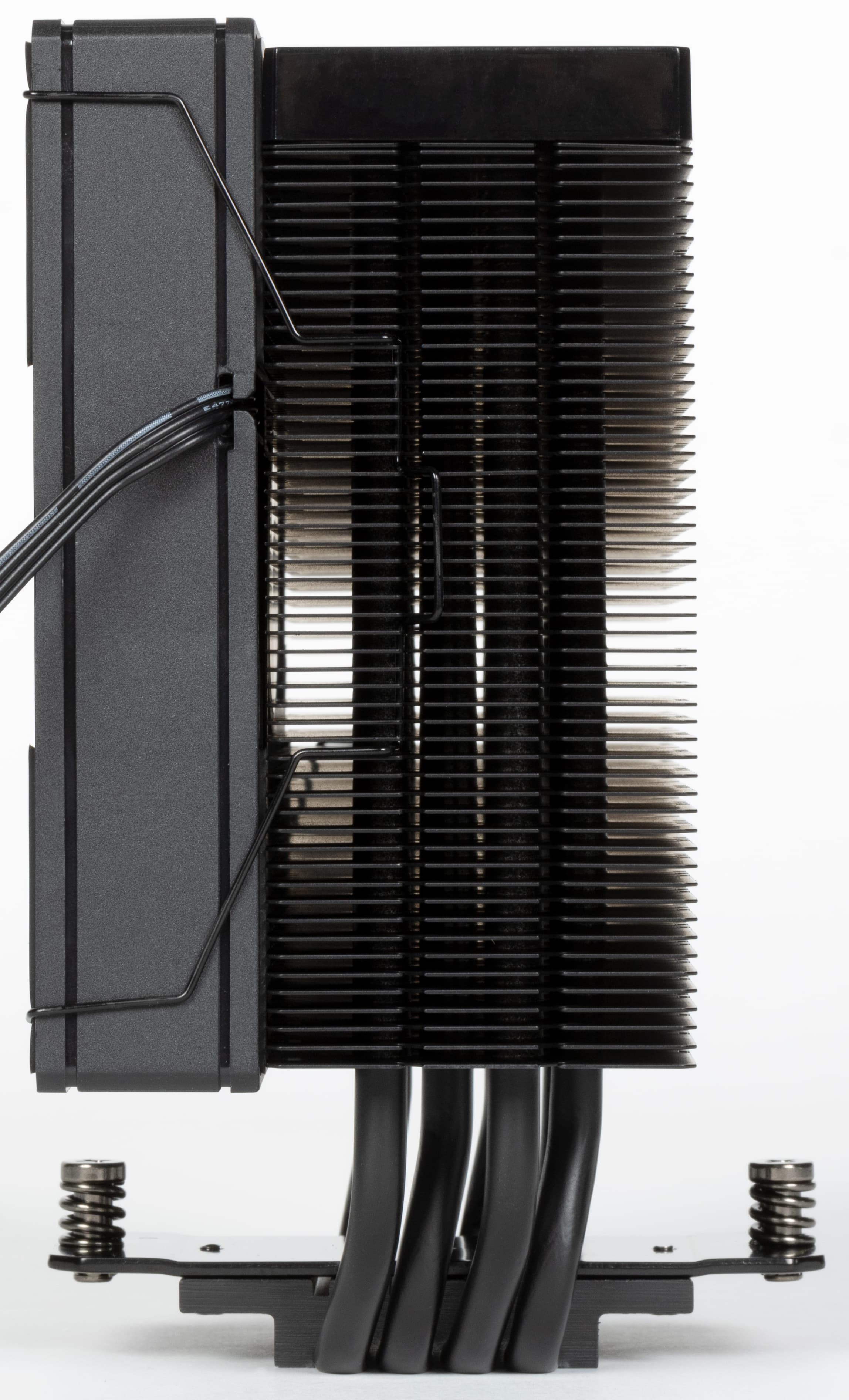 Вся поверхность радиатора, включая пластины, трубки и теплосъемник, но за исключением рабочей плоскости подошвы теплосъемника имеет черное полуматовое лакокрасочное покрытие. Это в какой-то степени улучшает теплоотдачу за счет излучения. Радиатор представляет собой стопку алюминиевых пластин, плотно насаженных на тепловые трубки. Тепловые трубки расположены вразбежку, что должно способствовать повышению эффективности кулера. Сверху радиатор прикрыт пластиковой декоративной крышкой.
