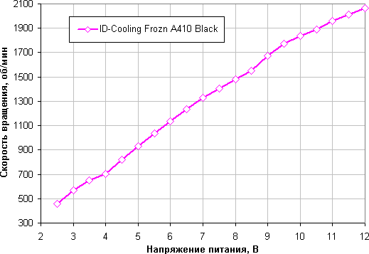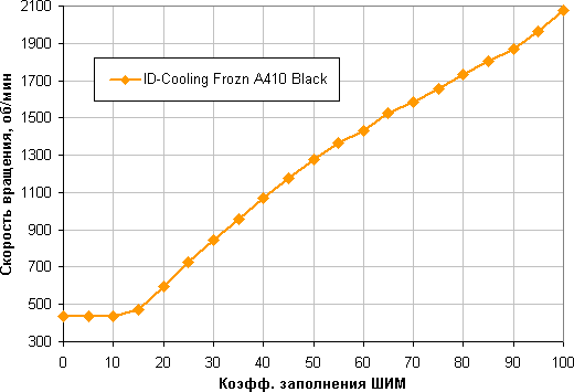 Хороший результат — плавный рост скорости вращения при изменении коэффициента заполнения (КЗ) от 10% до 100% и широкий диапазон регулировки. Отметим, что при КЗ 0% вентилятор не останавливается, поэтому в гибридной системе охлаждения с пассивным режимом на минимальной нагрузке такие вентиляторы придется останавливать, снижая напряжение питания.