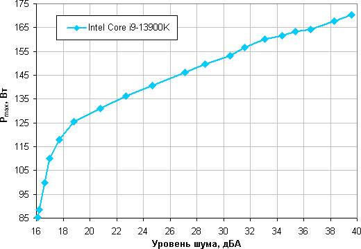 Приняв 25 дБА за критерий условной бесшумности, получим примерную максимальную мощность процессоров типа Intel Core i9-13900K, соответствующих этому уровню, это порядка 141 Вт. Гипотетически, если не обращать внимания на уровень шума, пределы мощности можно увеличить где-то до 170 Вт. Еще раз уточним: это в жестких условиях обдува радиатора нагретым до 44 градусов воздухом и для максимальной температуры процессора в 80 °C (в принципе допустимо 100 °C). При снижении температуры воздуха или увеличении максимально допустимой температуры процессора указанные пределы мощности для бесшумной работы и максимальной мощности возрастают.