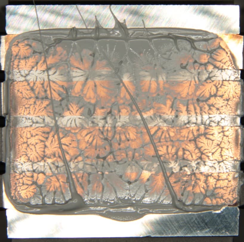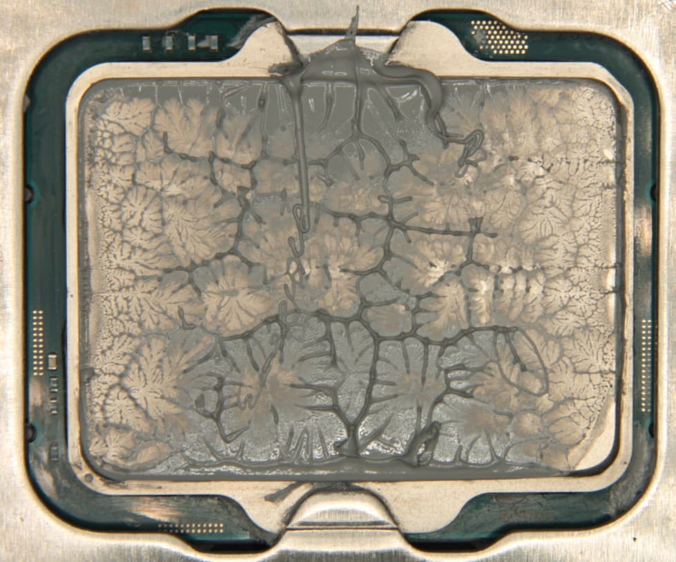 Видно, что термопаста распределилась тонким слоем почти по всей плоскости крышки процессора, а ее избыток выдавился по краям. Пятно плотного контакта большое.