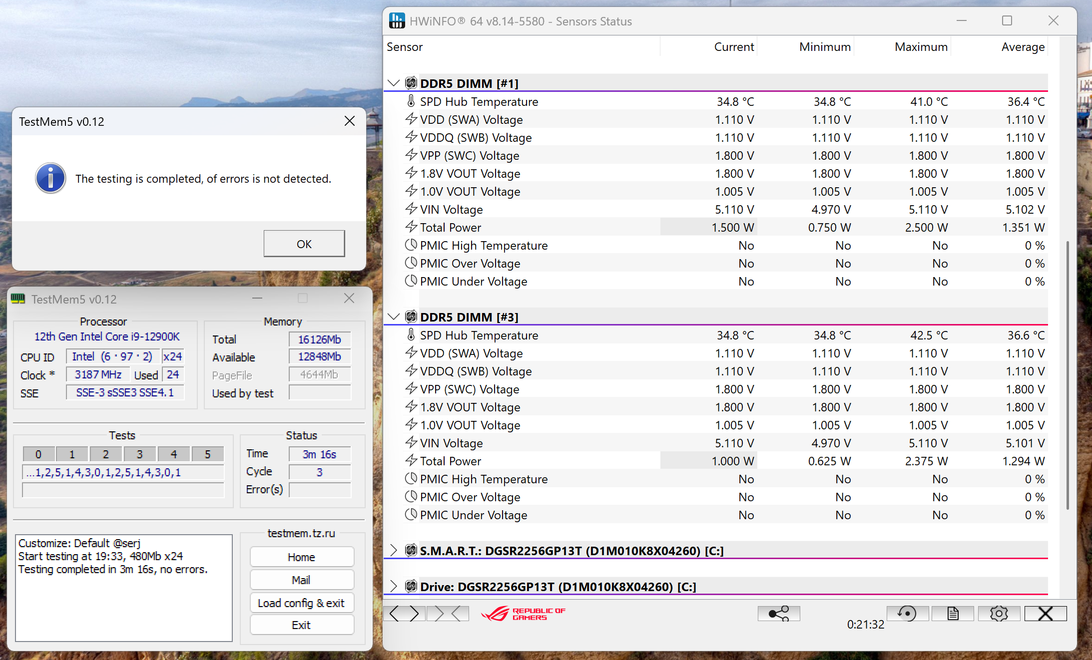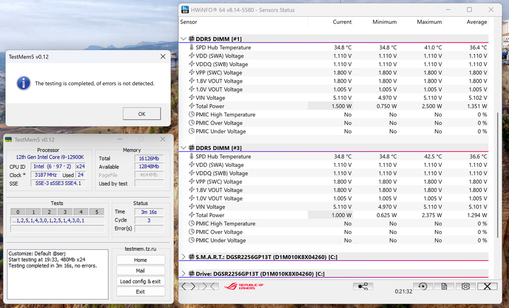 Естественно, нет никаких проблем с функционированием в штатном режиме. И радиатор для него действительно не нужен — максимум 42,5 °C за время выполнения теста. Которое при такой емкости модуля невелико, конечно, однако стоит учитывать, что стресс-тесты на тяжелых профилях от обычной работы далеки — и часто сыплют ошибками в ситуации, когда всё остальное прекрасно работает.